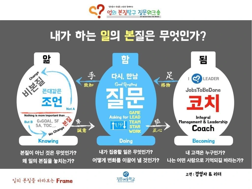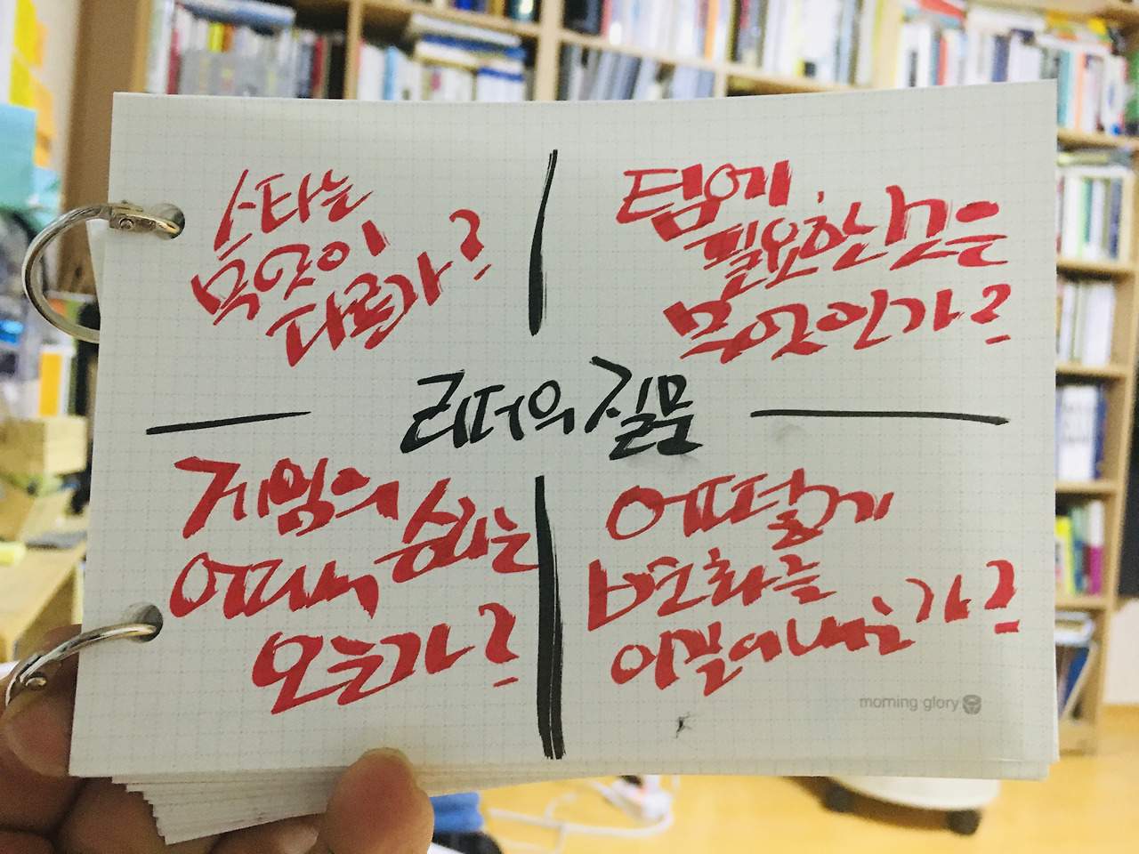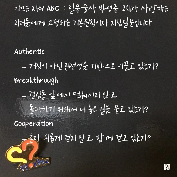 영화 매트릭스 1편, 트리니티와 네오가 만난 장면에 이런 대사가 있더군요. “우리를 이끄는 것은 질문이야.” 리더를 이끄는 질문, 팀을 이끄는 질문, 성장과 성공을 이끄는 질문을 앞으로 함께 탐구해 나갔으면 합니다.