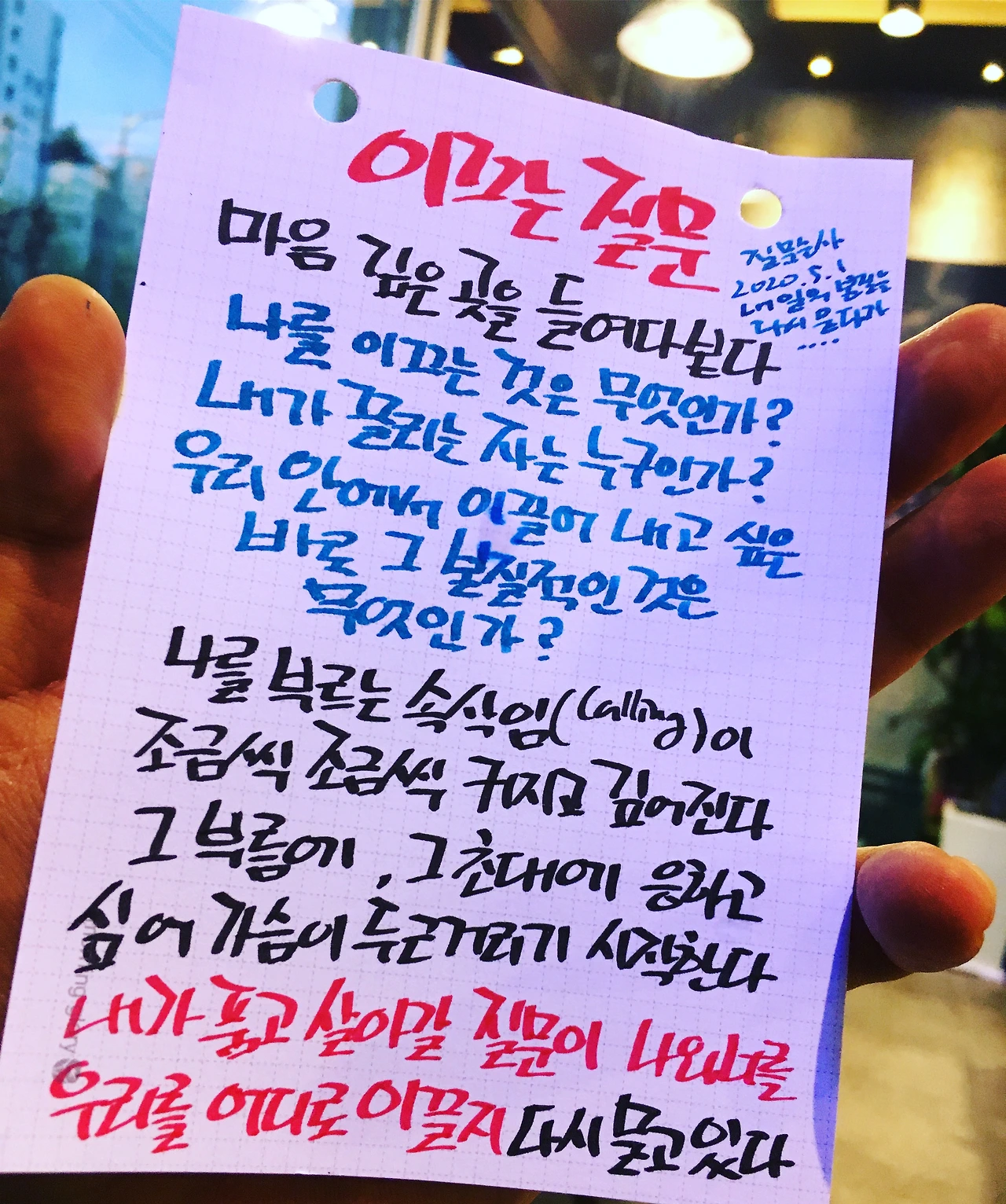<혁신가의 질문>을 출간한 이후 몇 년간 저를 위한 소소한 글들만 써 왔습니다. 주로 시를 많이 썼고, 틈틈이 질문 노트를 만들어 공유하기도 했습니다. 그동안 꾸준히 써왔던 시 중에서 80편을 엮은 시집 <다시, 묻다>도 세상에 나왔습니다. 첫 책을 꽤나 힘들게 써서인지, 두 번째 책은 제 자신을 토닥이며 쓰게 되었습니다. 이제는 다시 독자를 위한 글을 본격적으로 써야 할 시점입니다. 사실 올해 초부터 <가르치지 말고, 질문에 머물자>라는 책의 원고를 쓰고 있었습니다. HRD 담당자, 러닝 퍼실리테이터, 학교 교사, 기업 강사 등 교수자들을 위한 질문 수업을 담아보려고 했습니다.