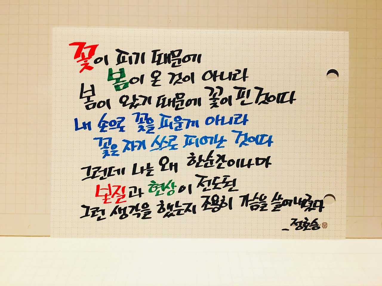 "꽃이 피기 때문에 봄이 온 것이 아니라, 봄이 왔기 때문에 꽃이 핀 것이다. 내 손으로 꽃을 피운 게 아니라 꽃은 자기 스스로 피어난 것이다. 그런데 나는 왜 한순간이나마 본질과 현상이 전도된 그런 생각을 했는지 조용히 가슴을 쓸어내렸다."_ 정호승