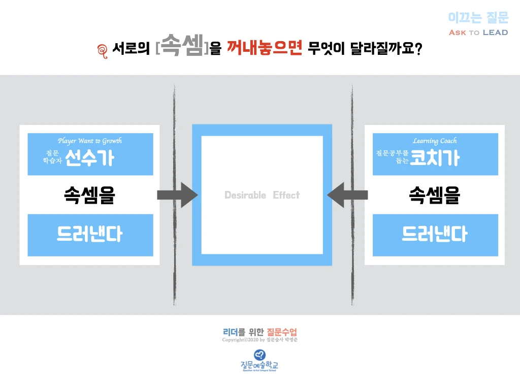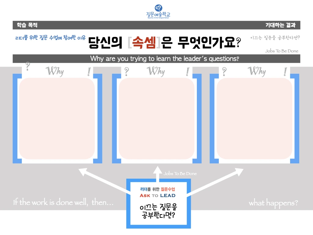 학습코치라는 역할을 맡은 제가 질문수업에 참가한 학습자들의 개별적 의도를 파악하는 일이 왜 필요할까요? 참가자의 속셈을 모르고 그저 제가 준비한 가르칠 내용들만 쭉 설명해도 될 것 같은데, 고집을 부리며 질문 공부를 하려는 당신의 솔직한 속셈을 툭 터놓고 이야기해 보라고 재촉합니다. 어떤 공부든 간에 학습자 스스로가 자기 자신의 속셈을 들여다보는 과정은 중요합니다. 꼭 거창한 목적을 들어내지 않아도 좋습니다. 솔직하고 진지하게 자신의 속셈을 마주하고, 표현해주시길 바라면서 속셈을 알려달라고 요청합니다.