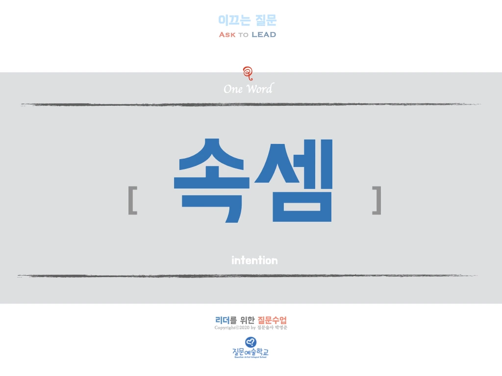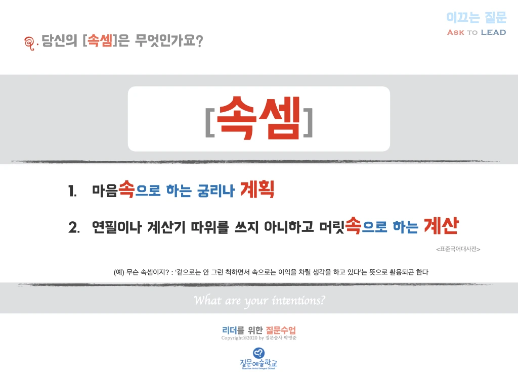 리더를 위한 질문수업의 첫 키워드는 속셈입니다. 리더를 위한 질문수업뿐만 아니라, 질문공부를 하고 싶다며 자발적으로 참석한 다른 학습자들에게도, 과정을 시작하면서 묻는 단어입니다. 학습의 시작점에서 묻기에는 조금은 가볍고, 자주 사용하지 않는 단어라 자극적이면서도, 첫 만남을 관통하는 단어입니다. 목적이라는 거창한 질문에 답하기는 부담스럽기도 해서, 솔직하게 의도를 밝혀주길 바라는 마음으로 선택한 단어입니다.