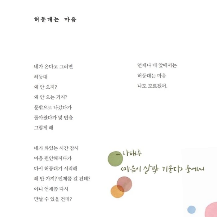 <허둥대는 마음>이라는 시를 찾았다. ‘네가 와 있는 시간 잠시 / 마음이 편안해지다가 / 다시 허둥대기 시작해’라는 문장과 ‘아니 언제쯤 다시 / 만날 수 있을 건데?’라는 질문이 담겨 있었다. 풀꽃 시인은 설레는 그대의 방문에 또 허둥대고, 다시 또 만나고 싶은 마음을 섬세하게 담아냈다. 나는 언제 이런 문장을 펼쳐낼 수 있을까 잠시 괴로워했다.