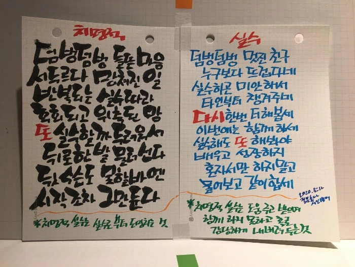 더불어서 또 다른 새로움은 한 사람의 심정이 아니라, 다른 사람의 입장도 담아보고 싶었다. ‘실수’는 혼자 한 것이 아니리라. 그래서 그 실수한 친구를 바라보는 또 다른 친구를 화자로 등장시켜 보고 싶었다. 둘 다 실수를 했고, 더 치명적 실수를 하지 않았으면 좋겠다는 마음에 이번에도 꼰대 같은 글이 되긴 했다.