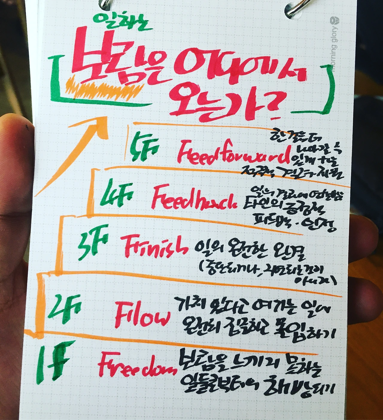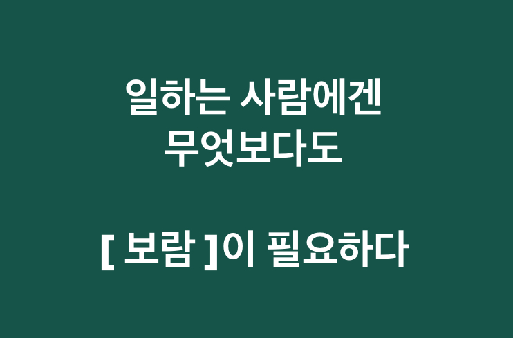이번 시간(글)의 핵심 단어는 [동기부여]가 아니라 일하는 [보람]으로 삼았습니다. 저는 늘 타인에게 어떤 기법을 통해서 동기부여를 받아야 하는지 회의적인 입장입니다. 타인이 부여해주는 동기가 정말 그 사람을 위한 것이 될 수 있을지 의심해 볼 필요가 있습니다. 내적 동기, 자발적 동기란 말도 있지만, 동기란 말 대신에 구성원들이 무엇에 [보람]을 느끼는지가 더 중요하다고 생각합니다. 오늘의 이끄는 질문은 보람, 더 구체적으로 [일의 보람]에 관한 것입니다.