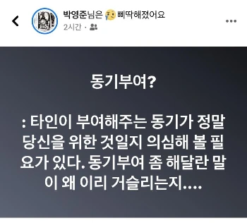여러분 팀원들을 둘러보면서, 조금 어두운 표정을 짓고 있는 이가 있다면, 그를 동기부여하려고 노력을 기울이기 전에, 근심하는 표정을 짓고 있는 이유가 무엇인지를 먼저 살펴봐야 하겠지요. 혹시 떠오르는 직원이 있나요? 동기부여 방법을 모르더라도, 리더로서 그분이 근심을 갖게 한 무거운 어떤 것을 먼저 찾고, 대신 없애줄 수는 없는 것이라도, 근심거리를 함께 나누거나, 작은 도움을 줄 수 있을 것 같습니다.