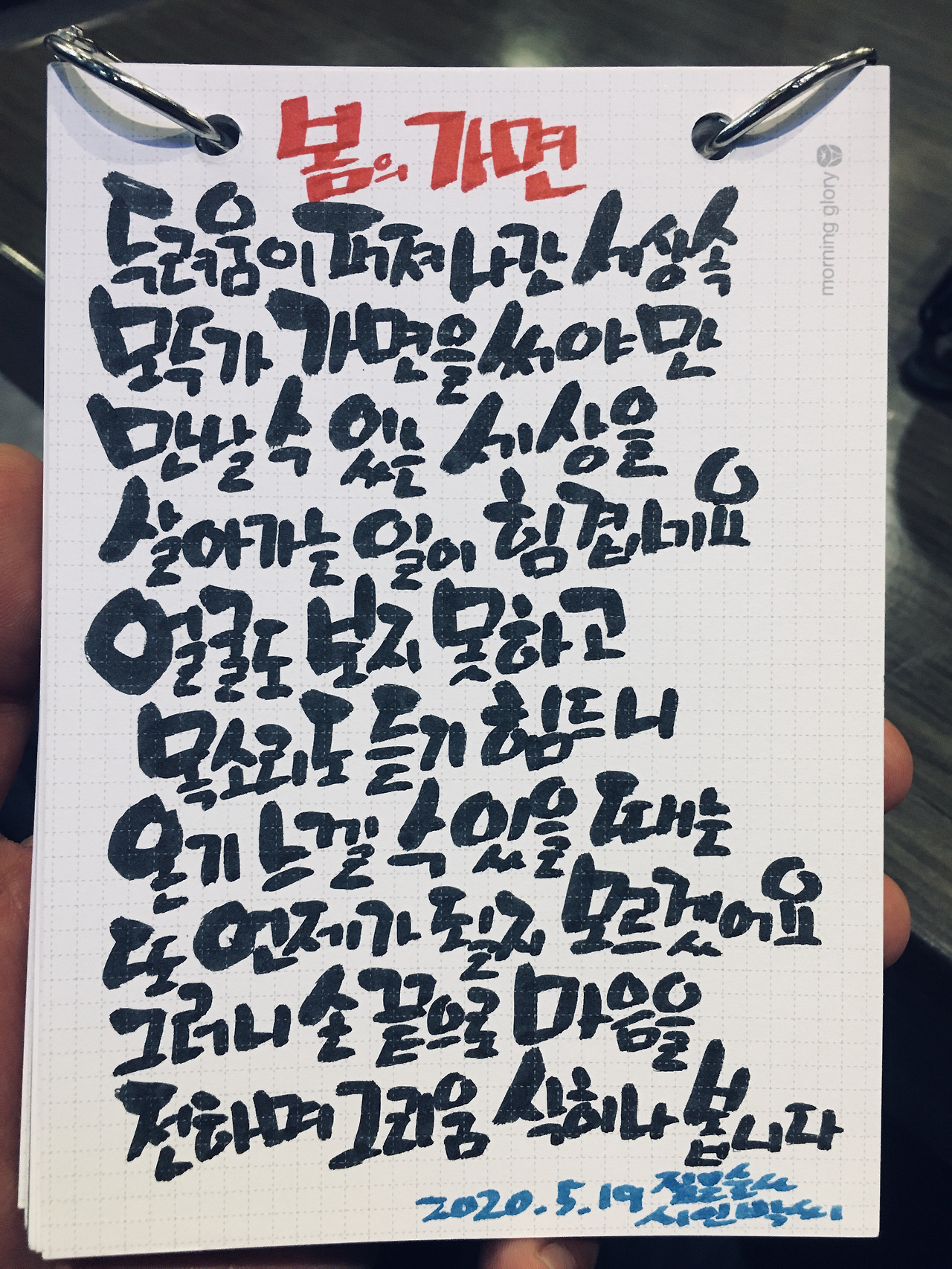 어제 밤에 끄적여둔 글을 살짝 수정해 공유해둡니다. 워크숍을 진행했는데, 여전히 마스크를 쓰고 만나야 하는 상황이 답답하고 속상했나봅니다. 2020년 봄은 기나긴 가면무도회로 기억될 듯 합니다.