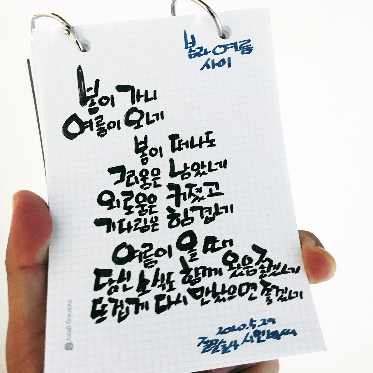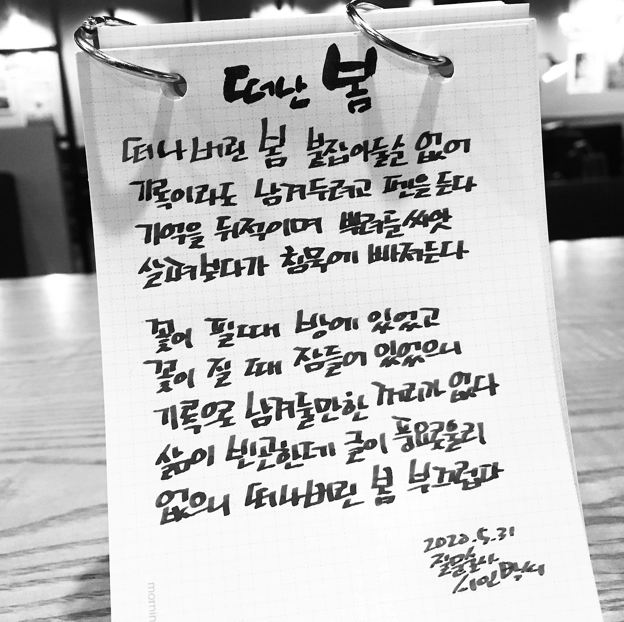 지난봄을 떠나보내기 아쉬웠나 봅니다. 코로나 19를 핑계로 잔뜩 움츠려 들고, 밖으로 돌아다니기보단 안으로 안으로 침잠하는 시간을 보내곤 했습니다. 덕분에 시를 쓰기엔 좋은 계절이었습니다. 여름이 되더라도 크게 달라질 것은 없어 보입니다만, 그래도 새롭게 혹은 다시 만날 사람들이 하나 둘 떠오르니 살짝 기대를 품어보고 있습니다.