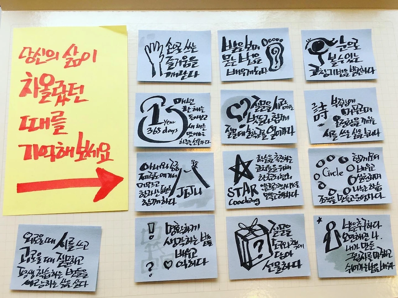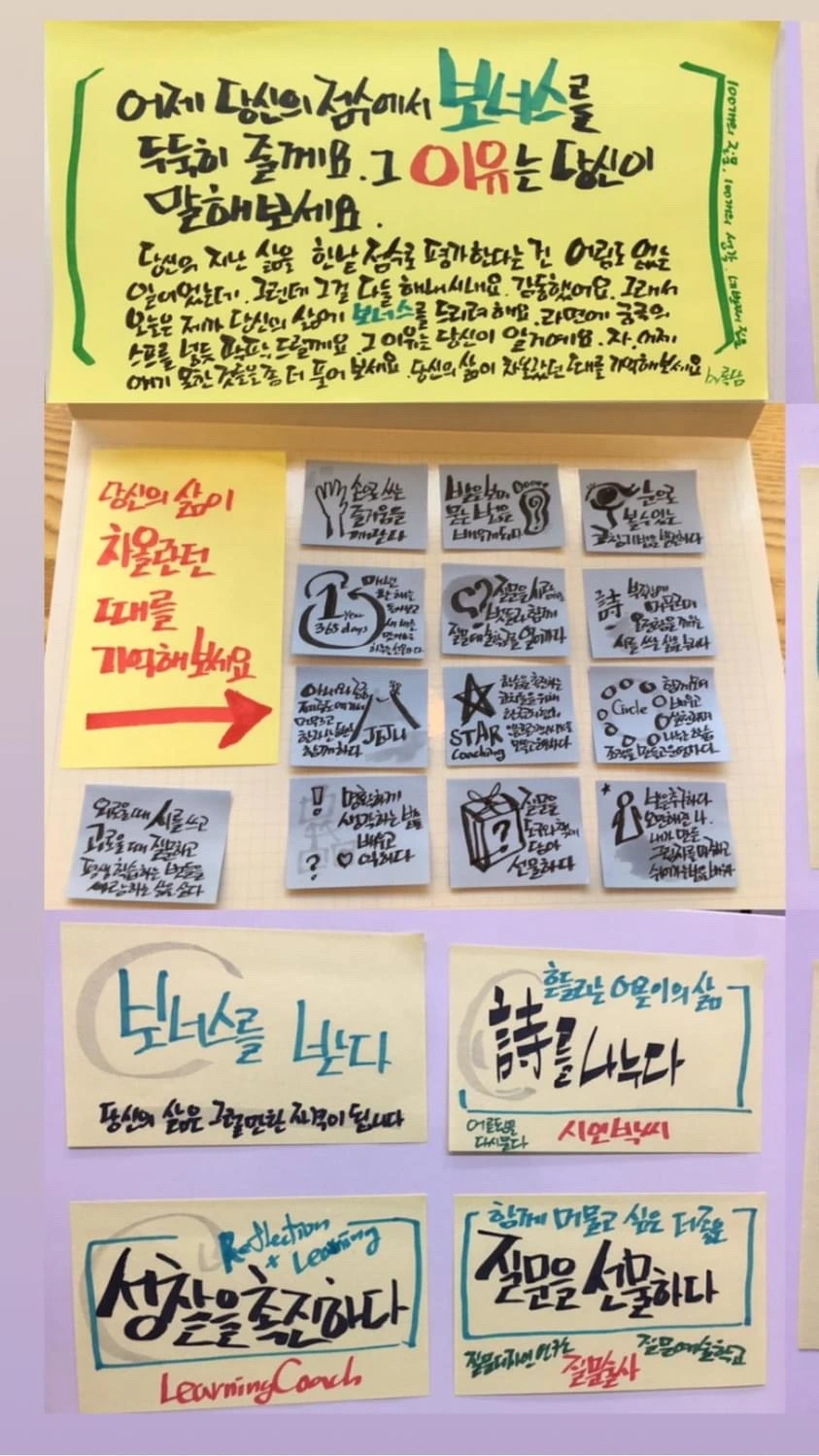 : 누구에게나 삶을 돌아보는 시간이 필요하지만, 워낙 바쁘게 살아가는 분들이 많습니다. 코칭이든 퍼실리테이션이든, 제가 하는 궁극적인 역할은 자기 삶을 성찰하고, 더 좋은 삶을 살아가기 위한 의미 있는 학습이 일어나도록 돕는 일입니다. 모르는 것을 알게 되고, 못 했던 것을 하게 되고, 어떤 존재가 되어가는 과정을 촉진하는 일, 그리고 그 길에서 자기가 걸어온 길과 걸어갈 길을 성찰하도록 촉진하는 것은 너무도 매력적인 작업입니다. 뭐 이게 주된 밥벌이이긴 하지만, 충분히 만족스러운 참가자라면 보너스를 주시겠지요. 이 경우 보너스는 '다시 만나자'라는 약속 정도가 될 것 같습니다.