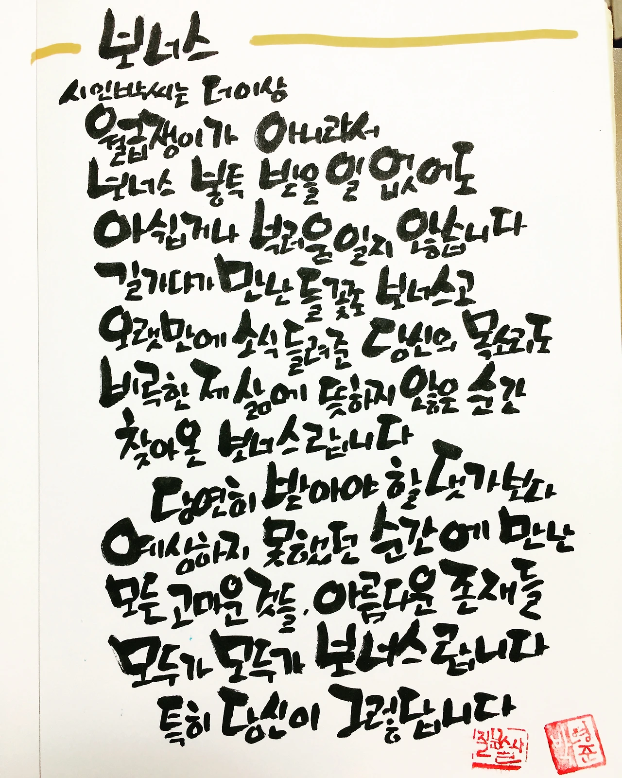 : 어른됨을 묻는 80편의 질문과, 스스로 그런 질문에 답하며 80편의 시를 그적였습니다. 그것을 엮어서 <다시, 묻다>란 시집을 냈습니다. 또 종종 제 시가 아니라, 제가 좋아하는 시를 손수 필사해서, 만나는 분들에게 주기도 합니다. 시는 지친 어른들의 삶을 위로하는 힘이 있더군요. 시를 선물 받은 다른 어른이가, 제게 보너스를 줄 수도 있을 것 같습니다. 저의 시시한 시집 한 권 사 주시는 게 가장 좋은 보너스일 것 같기도 합니다.