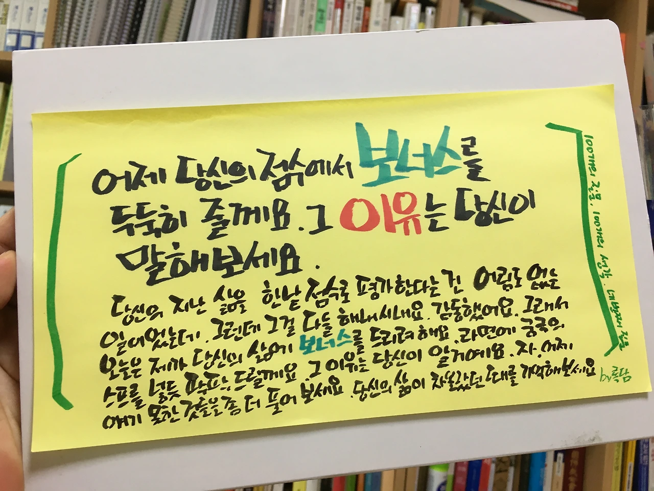 누군가에게 보너스를 받는다면, 제가 사랑하는 사람들의 삶에 무엇을 더해 주었는지를 기준으로 삼아서 보너스를 받았을 듯합니다. 스스로 주는 보너스가 아니라, 남이 준다면 어떤 이유로 보너스를 주실 것인지 생각해 보게 됩니다.