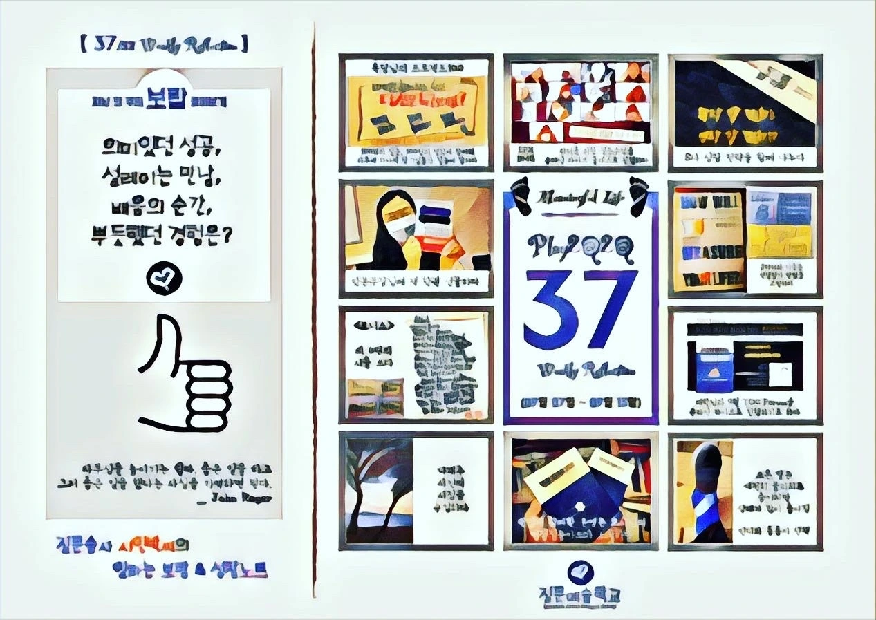 저는 제 자신의 삶을 성찰하는 일도 좋아하고, 타인에게 성찰할 수 있는 질문을 나누는 것도 좋아합니다. 매주 뿌듯했던 일 10가지를 기록해보는 시간을 제 자신에게 선물해주고 있습니다. 한 해를 마무리하면서, 새해 계획을 세우는 일 보다, 지난 한 해를 돌아보는 시간을 더 중요하게 생각하고, 지인들을 모아서 한 해 돌아보는 행사를 10년 넘게 진행해오고 있습니다.