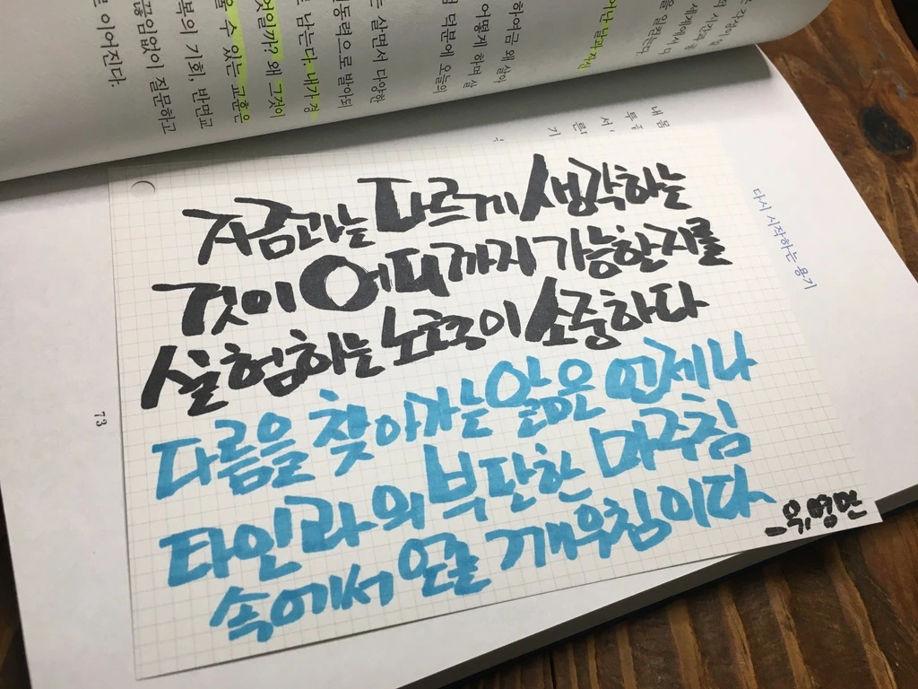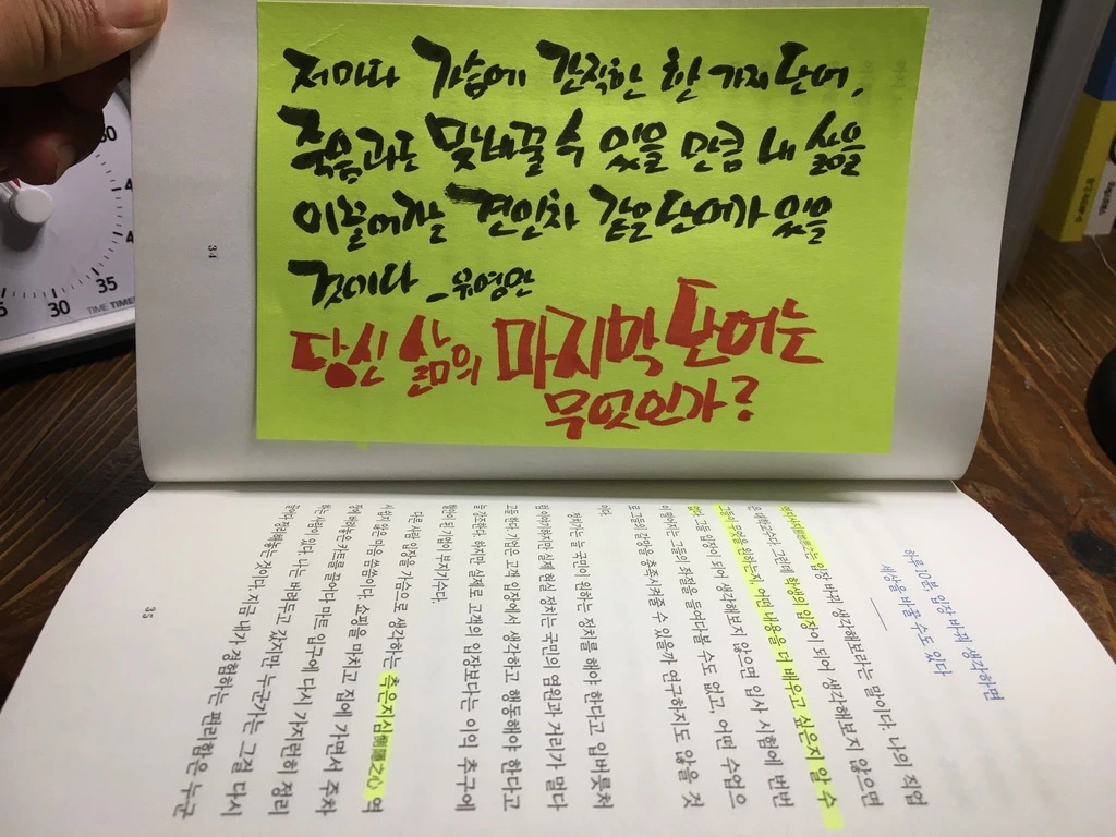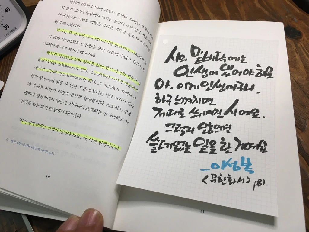 - p39. '글짓기를 하려면 억지로 사는 삶과 작별하고 어제와 다르게 살기 위해 용감하게 걸음을 내디뎌야 한다. 때로는 시행착오도 있고, 애간장이 녹기도 할 것이다.'