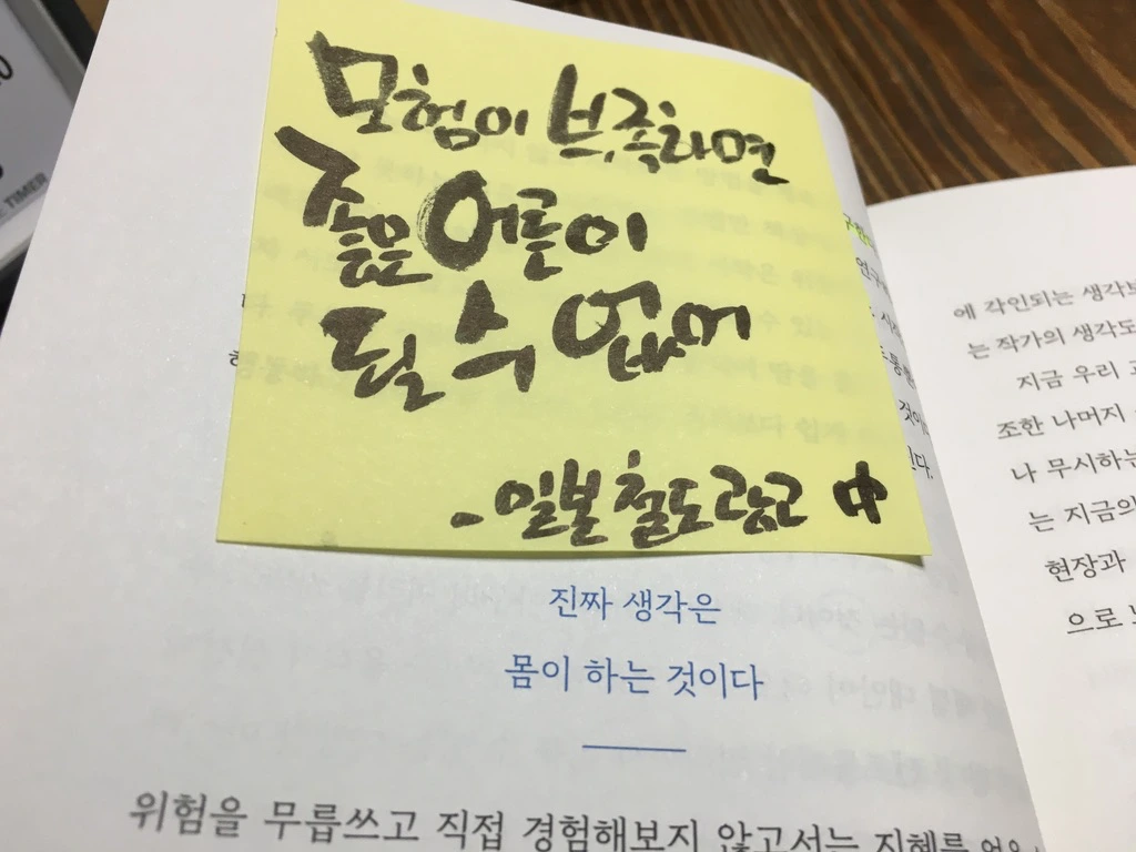 - p52. '일본 철도 광고 중에 "모험이 부족하면 좋은 어른이 될 수 없어."라는 게 있었다. 책상에 앉아서는 인생의 참맛을 느낄 수 없고 세상을 살아가는 지혜를 터득할 수 없다는 말이다.