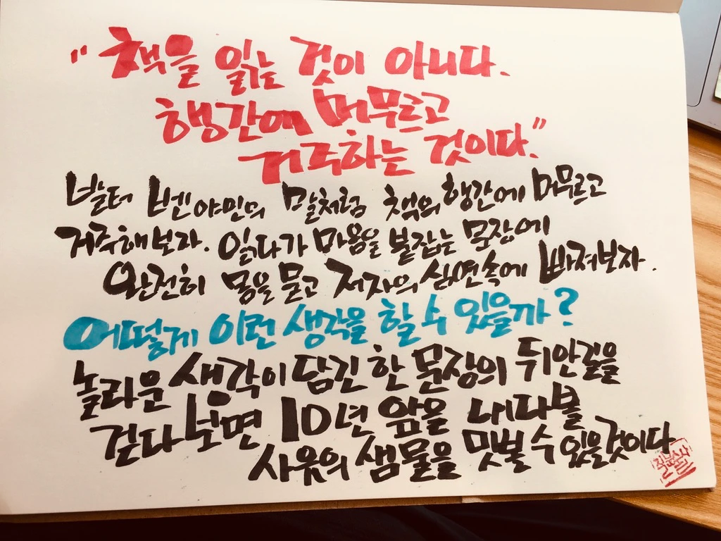 혼자 책 읽는 모습을 영상으로 남기는 것도 저에겐 새로운 시도이고, 책을 매일매일 떨어져 있는 사람들과 함께 읽는다는 도전도 새롭게 다가옵니다. 매일 이렇게 영상을 만들어 올릴 수는 없겠지지만, 함께 읽는 즐거움을 누릴 수 있어 더없이 기쁜 날이기도 합니다. 유영만 교수님의 책을 읽다 보니 더 잘 살고, 잘 쓰는 삶을 살아가고 싶어 집니다. 고맙습니다.