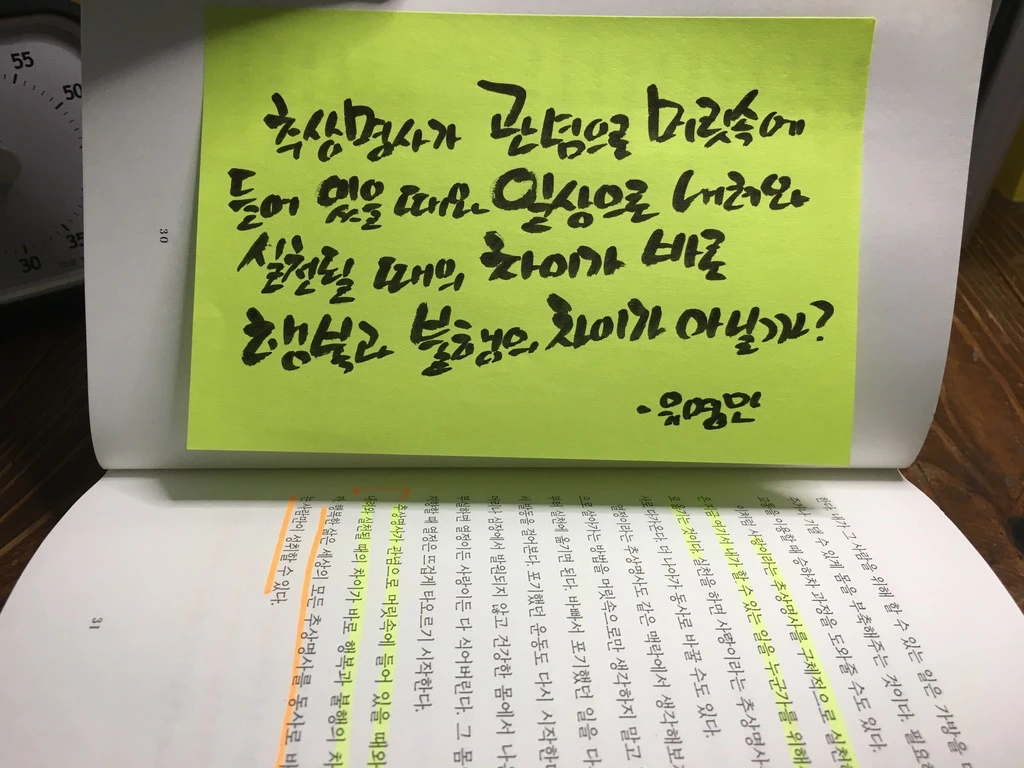 - p31. '추상명사가 관념으로 머릿속에 들어 있을 때와 일상으로 내려와 실천될 때의 차이가 바로 행복과 불행의 차이가 아닐까. 행복한 삶은 세상의 모든 추상명사를 동사로 바꿔 실천하는 사람만이 성취할 수 있다.'