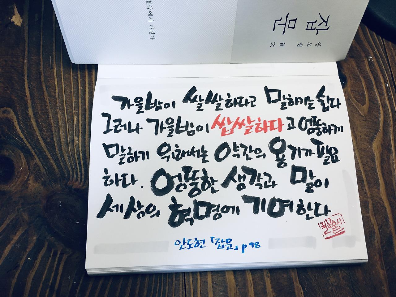 '가을밤이 쌀쌀하다고 말하기는 쉽다. 그러나 가을밤이 쌉쌀하다고 엉뚱하게 말하기 위해서는 약간의 용기가 필요하다. 엉뚱한 생각과 말이 세상의 혁명에 기여한다.' _ 안도현 <잡문> p98
