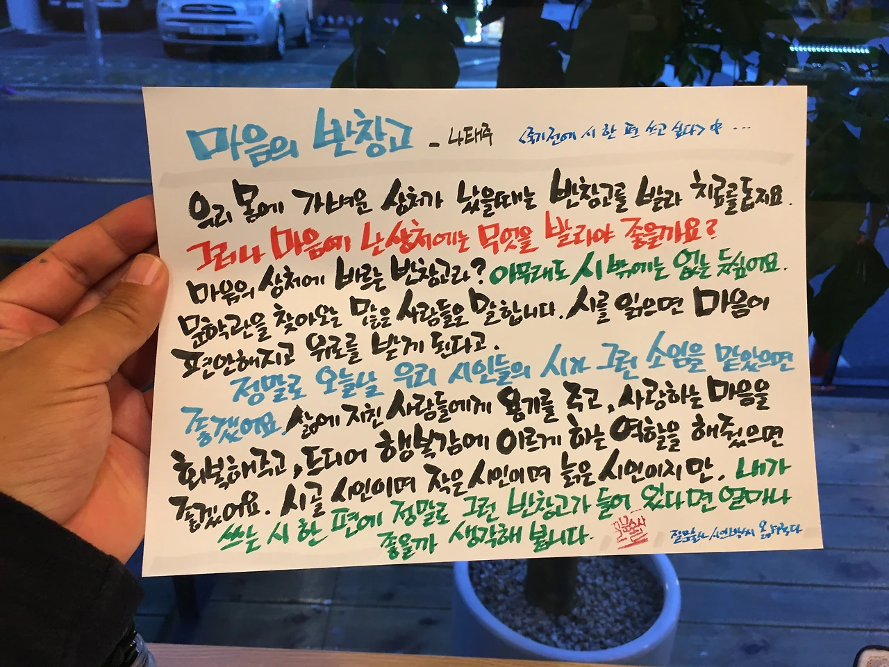 시인의 글을 읽다 보면 제가 왜 시를 쓰는지, 어떤 시를 쓰고 싶어 하는지를 되묻게 됩니다. 물론 저도 '마음의 반창고'같은 시를 쓰고 싶습니다. 시집 한 권을 출간했지만 제가 쓰는 시는 아직 보잘것없습니다. 그저 제 자신을 토닥이며 쓸 때가 많습니다. 아직 친구들을 사랑하는 마음을 충분히 담아내지 못해서일 것이라고 생각해보곤 합니다. 언젠가는 반창고 같은 시도 쓸 수 있겠지요. 아직 시인이라고 하기에 부끄럽지만 그래도 시를 쓰는 삶을 살고 있어서 좋습니다.
