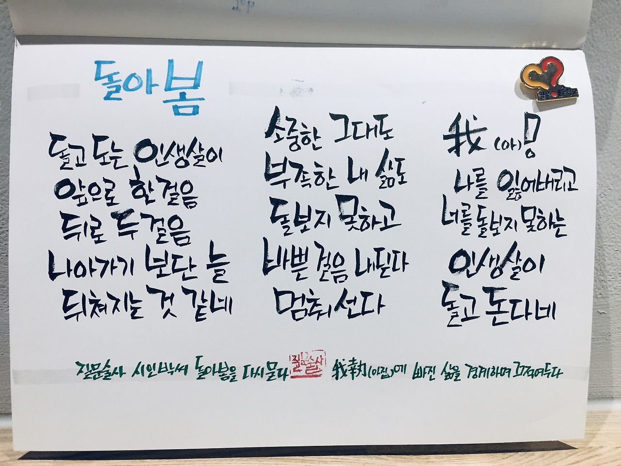 저는 수락산 자락에 살고 있습니다. 이 세상 소풍을 끝내고 [귀천]하신, 천상병 시인의 흔적이 곳곳에 남아있는 곳이지요. 7호선 수락산역에서 내려 수락산 계곡으로 가는 길을 따라 걷다 보면, 돌고 돌아야 읽을 수 있는 시들이 있습니다. 돌고 도는 인생이지만, 시 한 편 읽을 수 있는 여유가 있는 삶이었으면 좋겠습니다. 천상병 시인의 <아침> 시를 필사하고, 낭송해본 영상을 아래에 첨부해 둡니다.