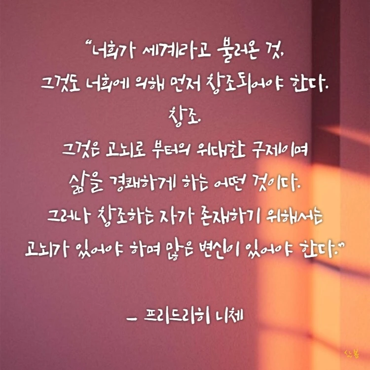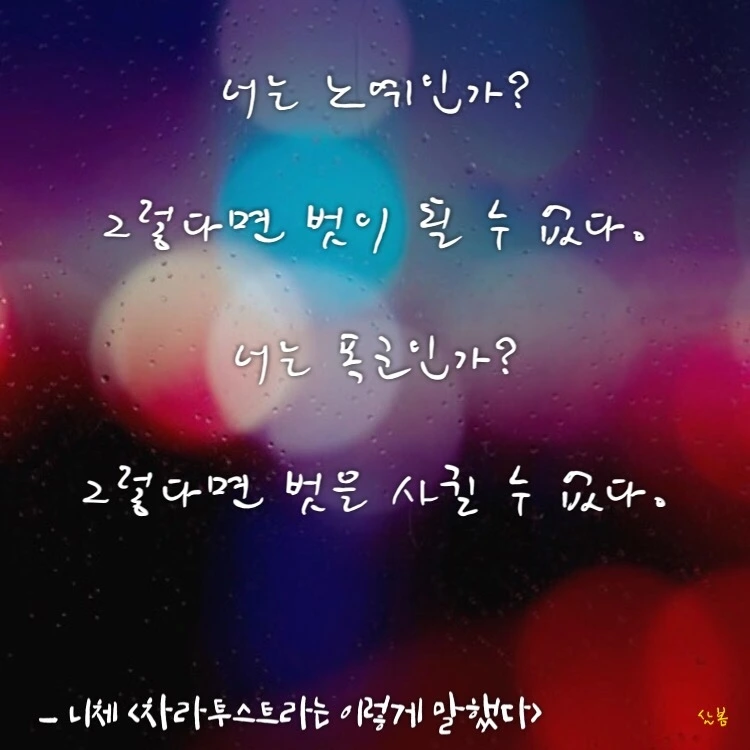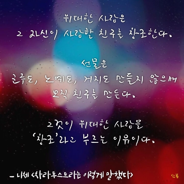 오늘도 칩거 중인 저는, 저를 돌보며 틈틈이 니체의 ‘차라투스트라’를 다시 읽고 있습니다. 제게 일어난 변화가 무엇인지 살펴보기에 좋은 친구의 글이 필요했습니다. 니체는 정말 좋은 친구이자, 위험한 친구입니다. 이 친구는 제자라고 자신을 추앙하며 따라다니는 사람들을 싫어했고, 저 역시 저를 ‘스승’이라고 부르는 이들을 피해 도망 다니곤 했습니다.