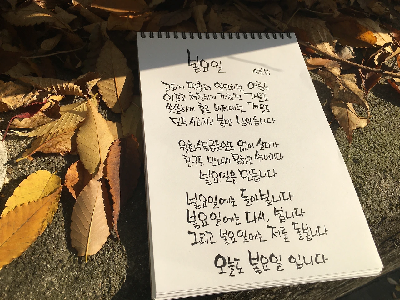 ‘봄요일’이란 시를 써 봤습니다. 앞으로 저를 만나는 날이 그런 봄과 같은 날이었으면 좋겠습니다. 서로에게 서로의 봄을 선물하기 위해 만났으면 좋겠습니다. 그런 날을 기다리며, 조금 더 돌봄의 시간에 머물도록 하겠습니다.