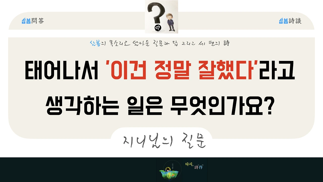 삼봄이 '이건 참 잘했다'라고 생각하는 8가지 선택에 관한 이야기, 그리고 삼봄이 좋아하는 3편의 시를 담아서 팟빵에 올려두었습니다. 팟빵에서 '삼봄일기' 들어주시고, 구독해주시면 좋겠어요.