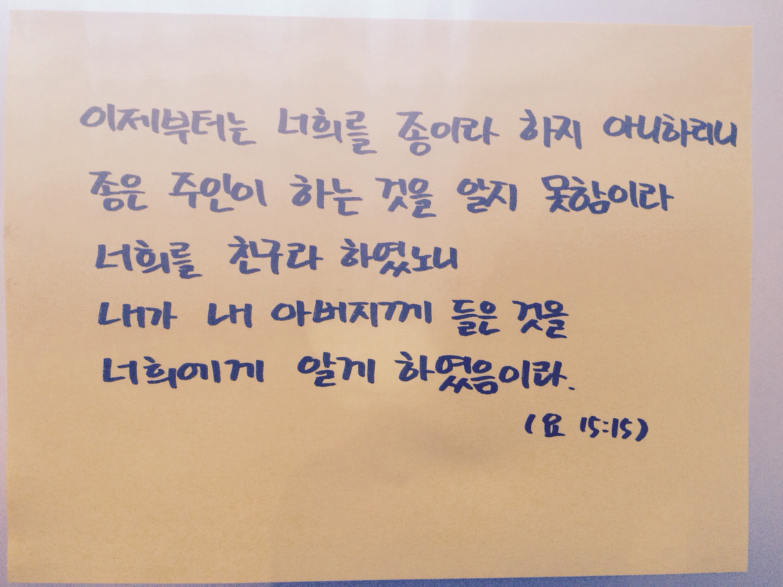 '이제부터는 너희를 종이라 하지 아니하리니 종은 주인이 하는 것을 알지 못함이라 너희를 친구라 하였노니 내가 내 아버지께 들은 것을 다 너희에게 알게 하였음이라' _ (요 15:15)
