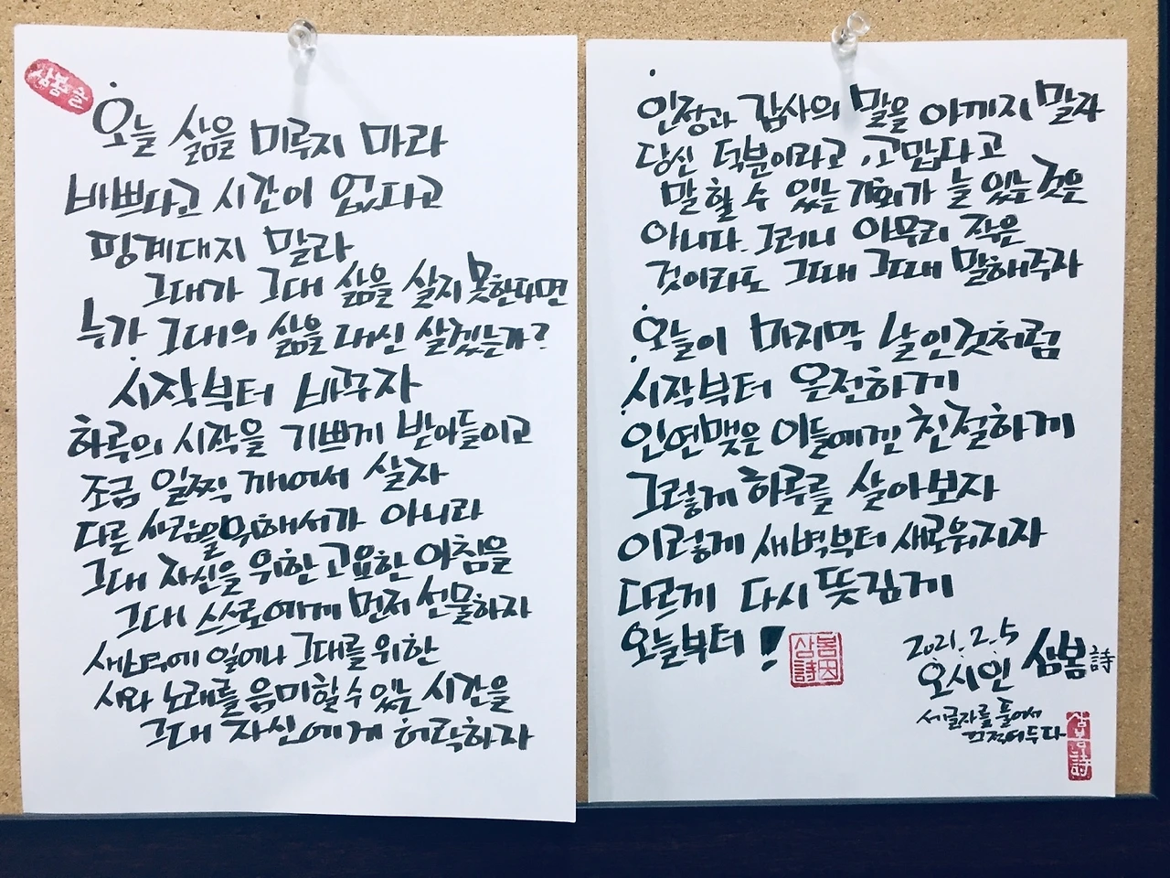 2월 즈음에 '오/시/인'이라는 세 글자를 풀어서 삼행시를 만들었습니다. '오늘이 마지막 날인 것처럼 / 시작부터 온전하게 / 인연을 맺은 이들에겐 친절하게'. 오늘도 시인으로 살고 싶어서, 새벽 5시에 일어나 내게 가장 좋은 선물을 주는 삶이 고마워서.... 조금 더 길게 풀어서 적어둔 글을 여러분에게도 선물로 보냅니다.