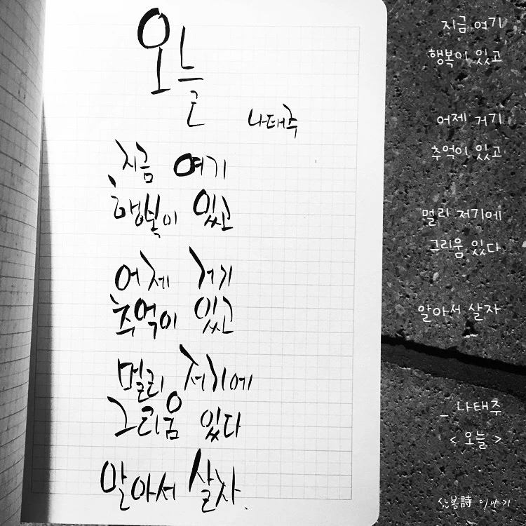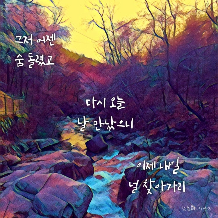 어제 숨 돌리며 시 한편 쓰고오늘 날 위해서 꽃 씨를 심고이제 널 만나러 또 걸어 봅니다