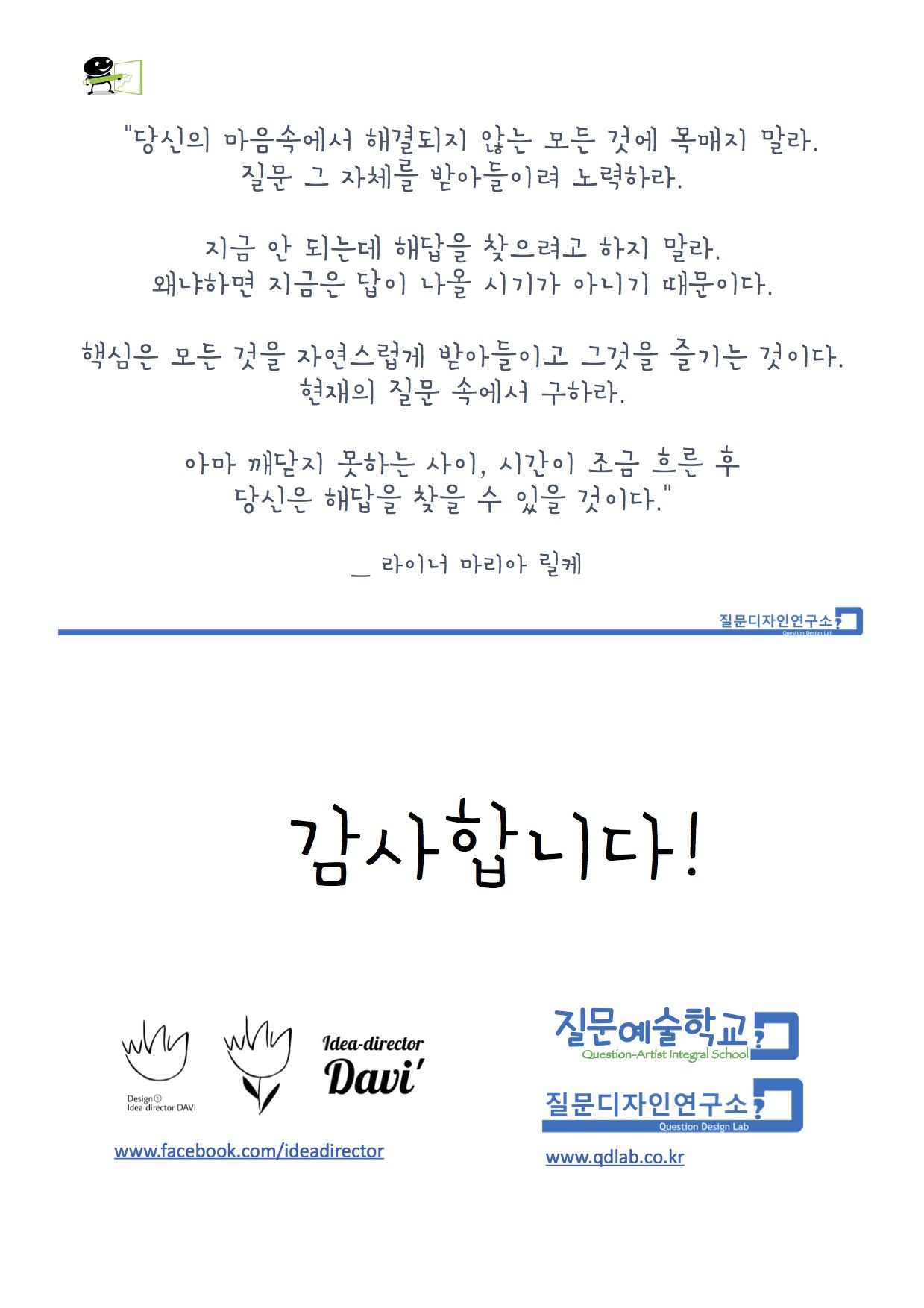 마지막 페이지는 제가 좋아하는 시인, 릴케의 글로 마무리 했습니다. 질문예술학교에서 함께 교류하기 원하신다면, 페이스북 그룹에 가입해주세요. https://www.facebook.com/groups/Qartschool/