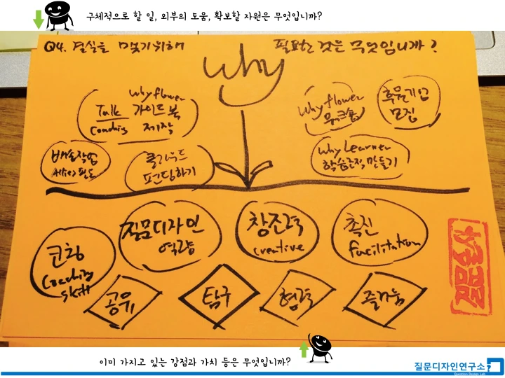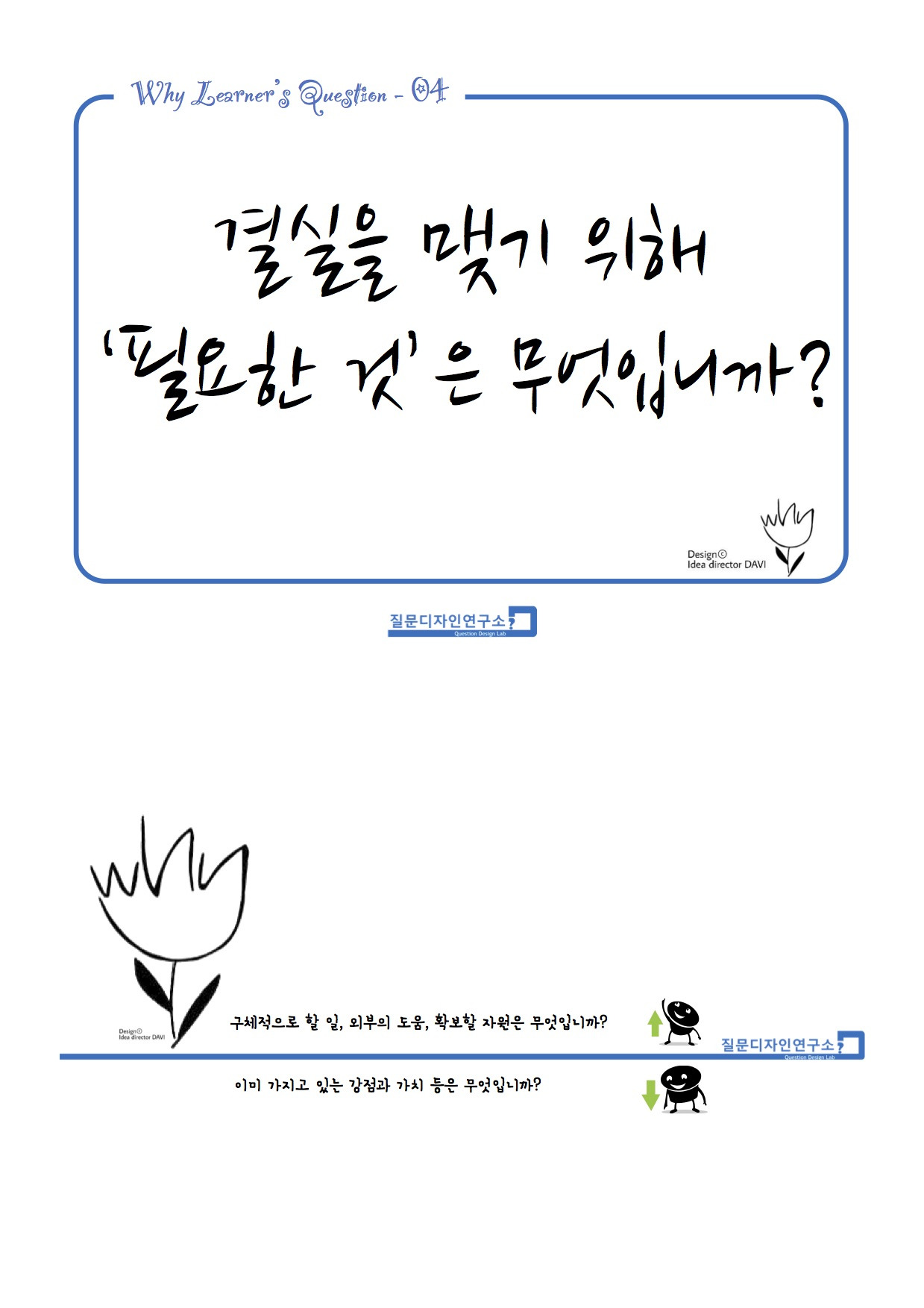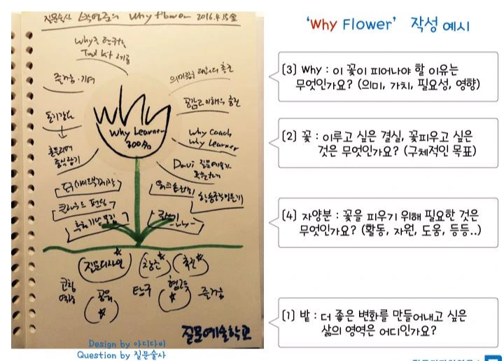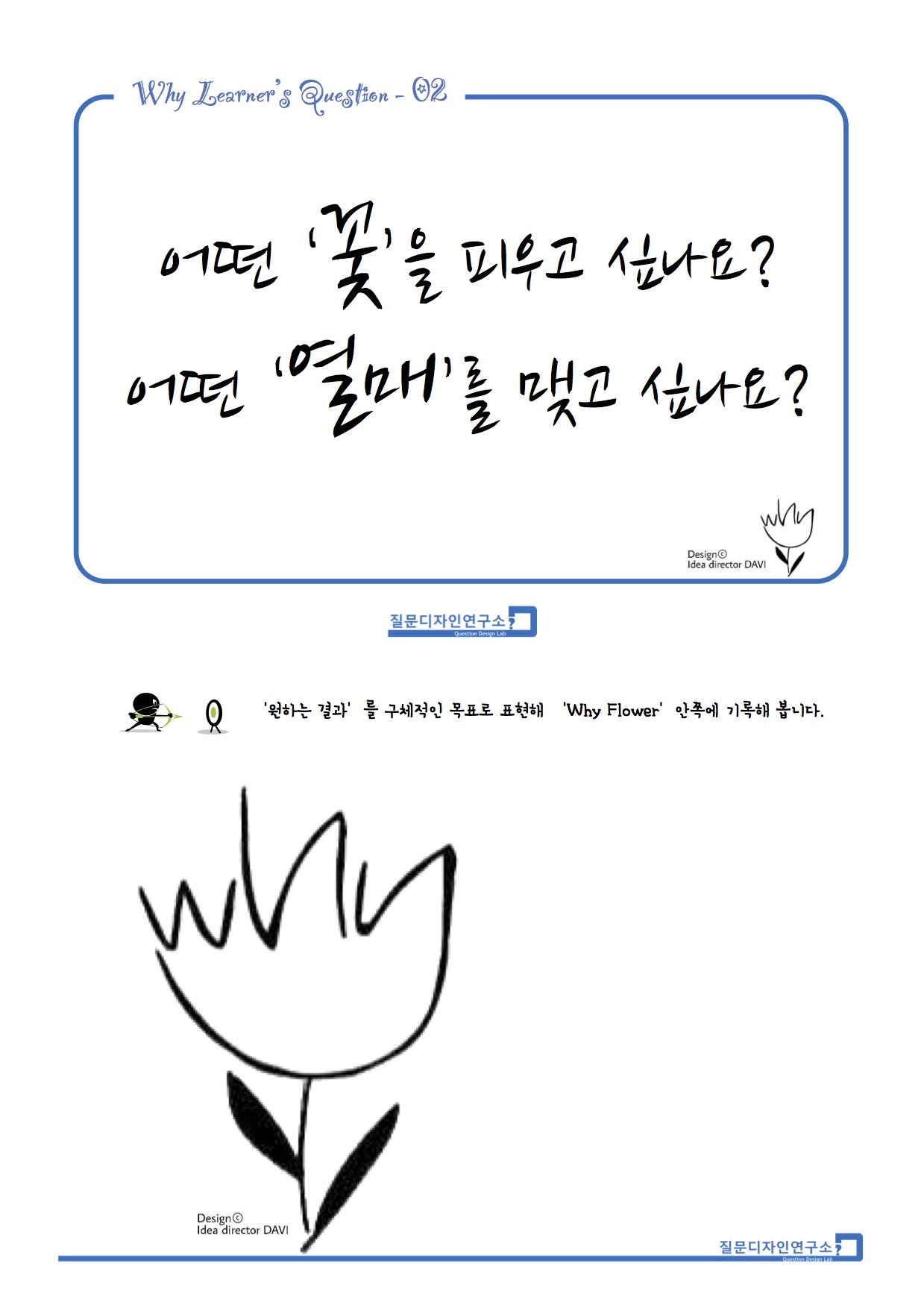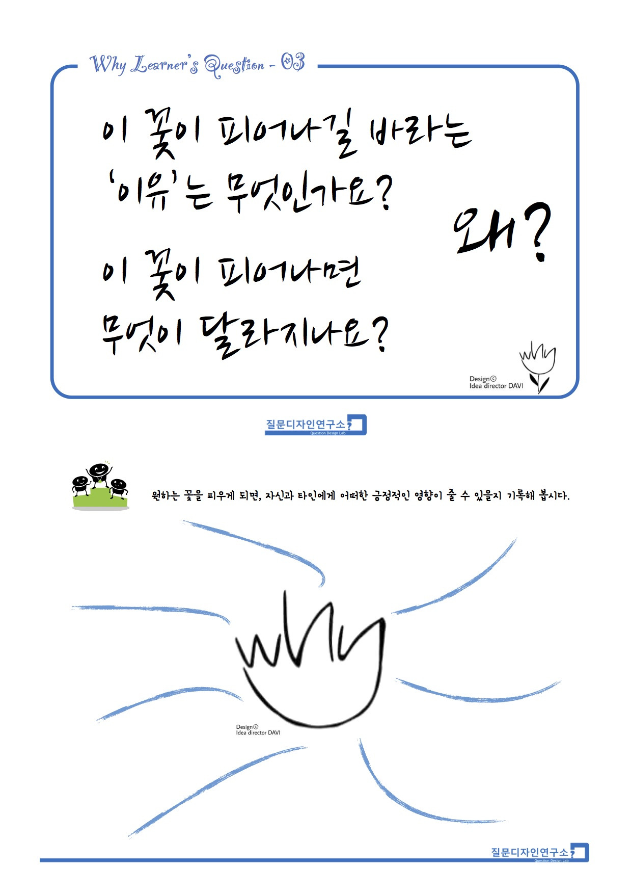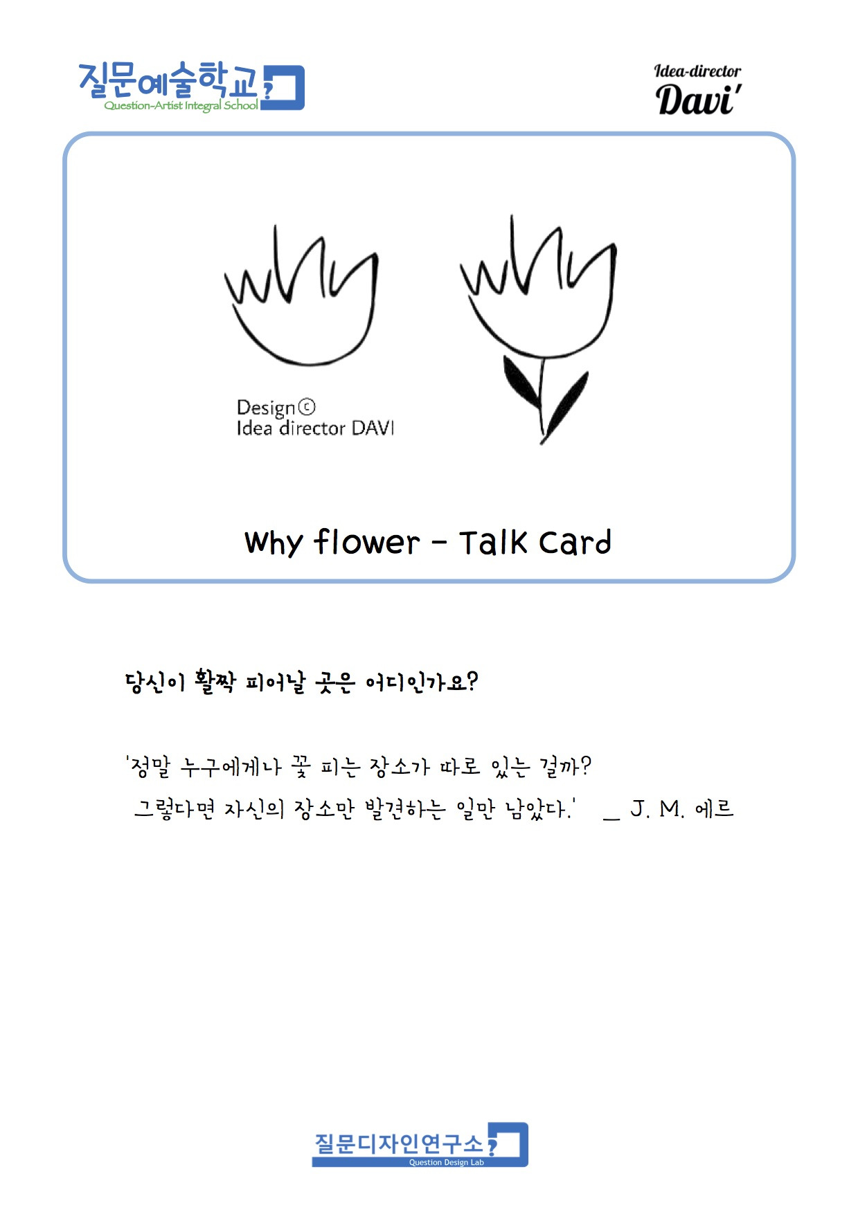 Why Artist인 아디다비님의 'Why Flower' 스티커를 활용해서 서로의 'Why'가 꽃피울 수 있는 간단한 대화 도구를 만들어 봤습니다. 질문예술학교라는 작은 모임을 통해 소개한 내용인데, 더 많은 분들이 활용할 수 있도록 양식과 활용방법을 안내합니다. 본 매뉴얼은 Why Flower를 디자인하신, 아디다비님의 허락하에 질문디자인연구소에서 제작되었으며, 누구나 비상업적인 용도로 활용할 수 있습니다. (상업적인 용도로 Why Flower 디자인을 활용하시려는 경우 꼭 사전에 저작자인 아디다비님의 허락을 구해주셨으면 합니다.) 아직 초안입니다. 많은 분들의 피드백을 받아 점차 수정해 나가려고 합니다.