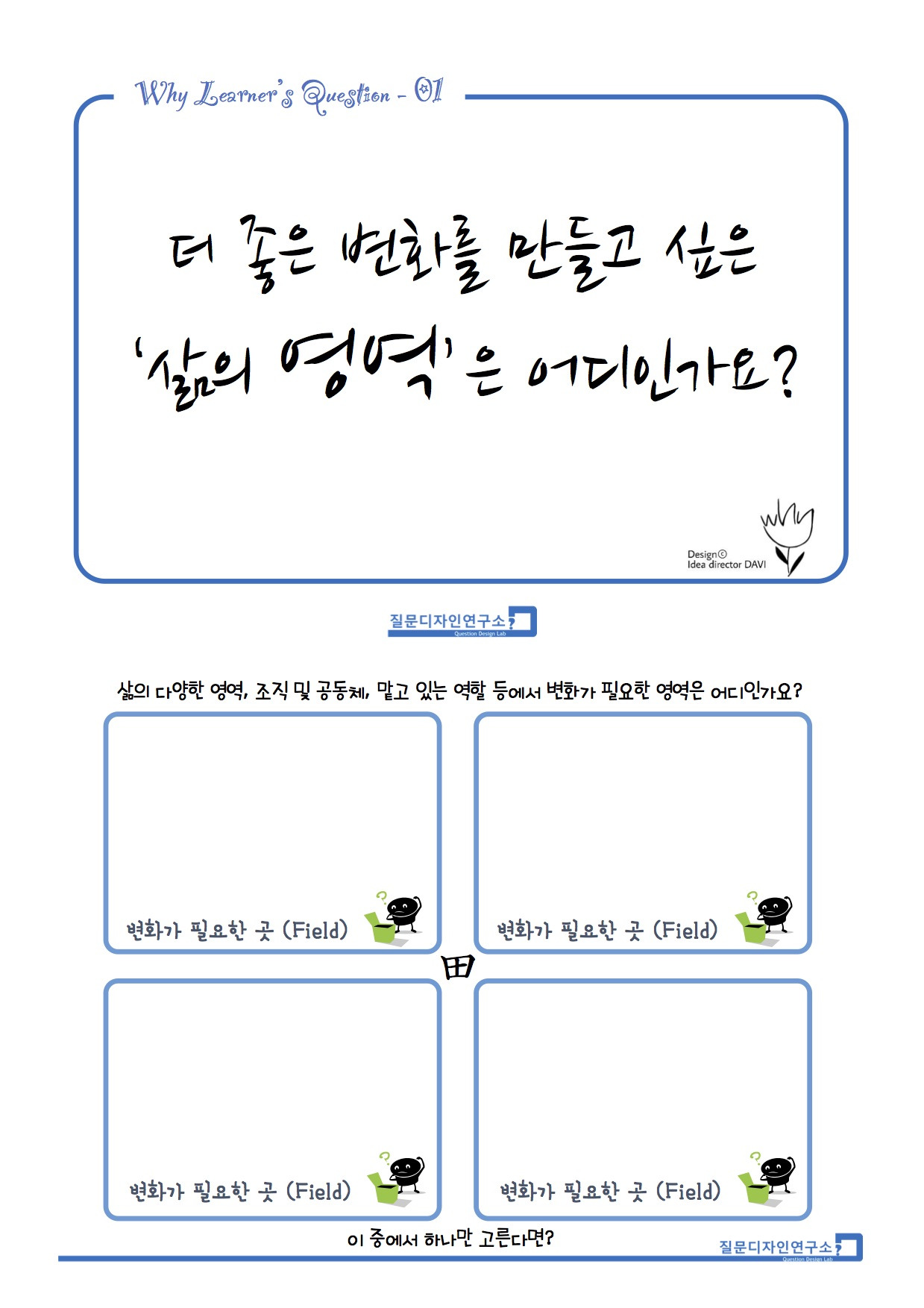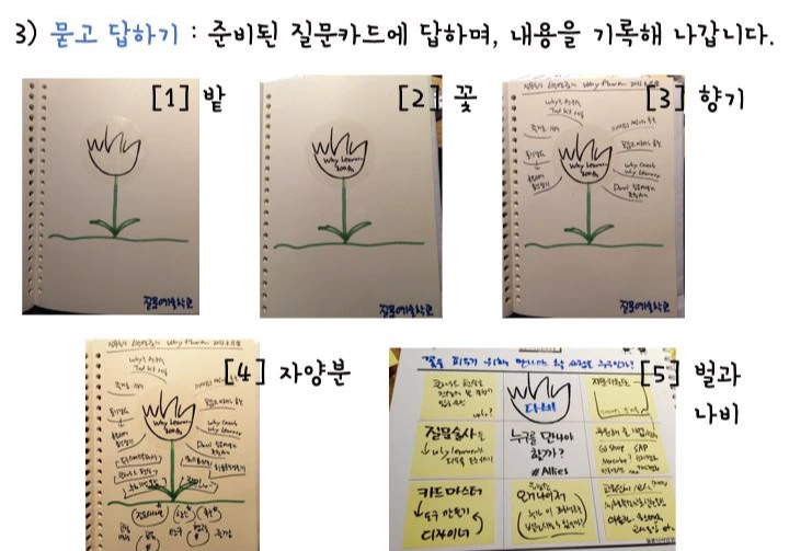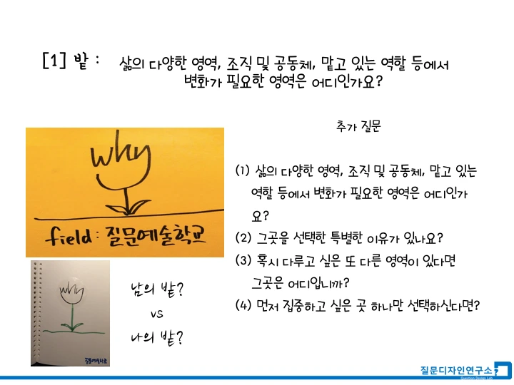 씨앗을 심으려면, 일단 밭부터 골라야겠지요. 대화 주제를 선택하는 단계입니다. 변화가 필요한 영역에 대해 대화를 나누고, 이번에 Why 씨앗을 심을 곳 하나를 선택하면 됩니다. 작은 포스트잇으로 작성해 붙이면 더 좋습니다.
