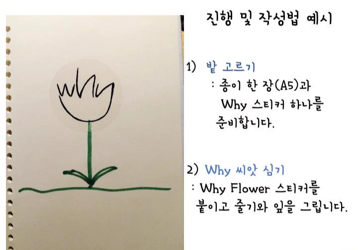 'Why 스티커'를 한장과 A4지 한장을 가지고 진행할 수도 있지만, 이 워크시트 전체를 출력해서 사용해도 됩니다. 스티커가 없는 경우 종이에 직접 Why 모양의 꽃과 줄기, 잎을 그려두셔도 됩니다. 대화를 나누고 기록할 준비가 되면, 질문 하나 하나를 음미하며 답하는 시간을 갖습니다.