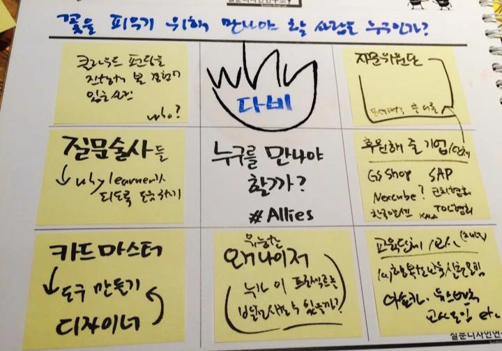 꽃을 가꾸는 농부는 물론 여러분 자신이겠지요. 그런데 의미있는 프로젝트를 혼자 힘으로만 진행하기 참 어렵습니다. 누구와 함께, 누구의 도움을 받아야 이 꽃이 온전히 피어날 수 있을까요? 핵심적인 협력자가 누구일지, 누구와 대화를 나눌지를 정리해 보셨으면 합니다.