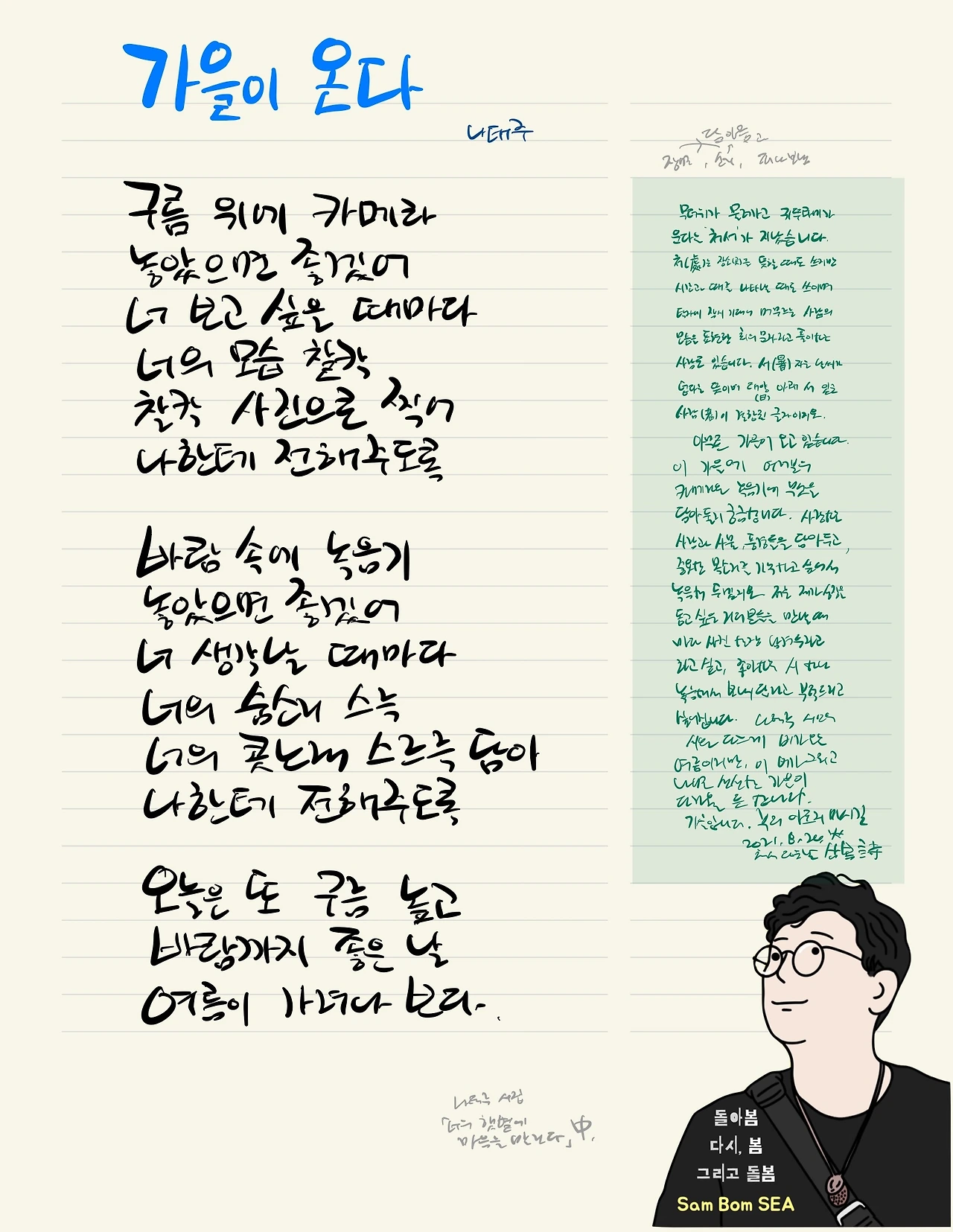 가을이 오면 어떤 장면을 담아두고 싶고, 어떤 소리를 담아두고 싶으신지 궁금합니다. 여러분의 스마트폰 카메라에는 어떤 장면을 담아두고 싶나요? 누구나 비슷하겠지만, 각자 사랑하는 사람이나 사물, 풍경들이 담기겠지요. 가을이 되면 자연스럽게 울긋불긋 일상의 아름다운 가을 풍경을 담게 되는데, 올 가을에는 좋아하는 벗들의 얼굴을 좀 더 자주 담아두고 싶습니다. 나태주 시인은 구름 위에 카메라를 놓고, 바람 속에 녹음기를 놓았으면 좋겠다고 하네요.