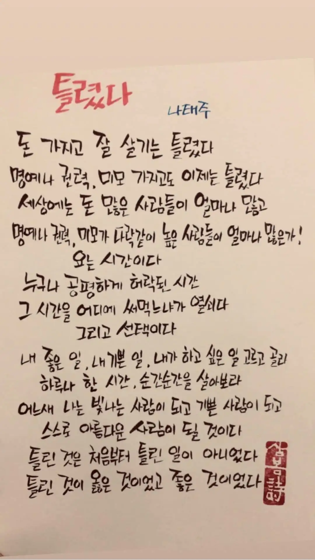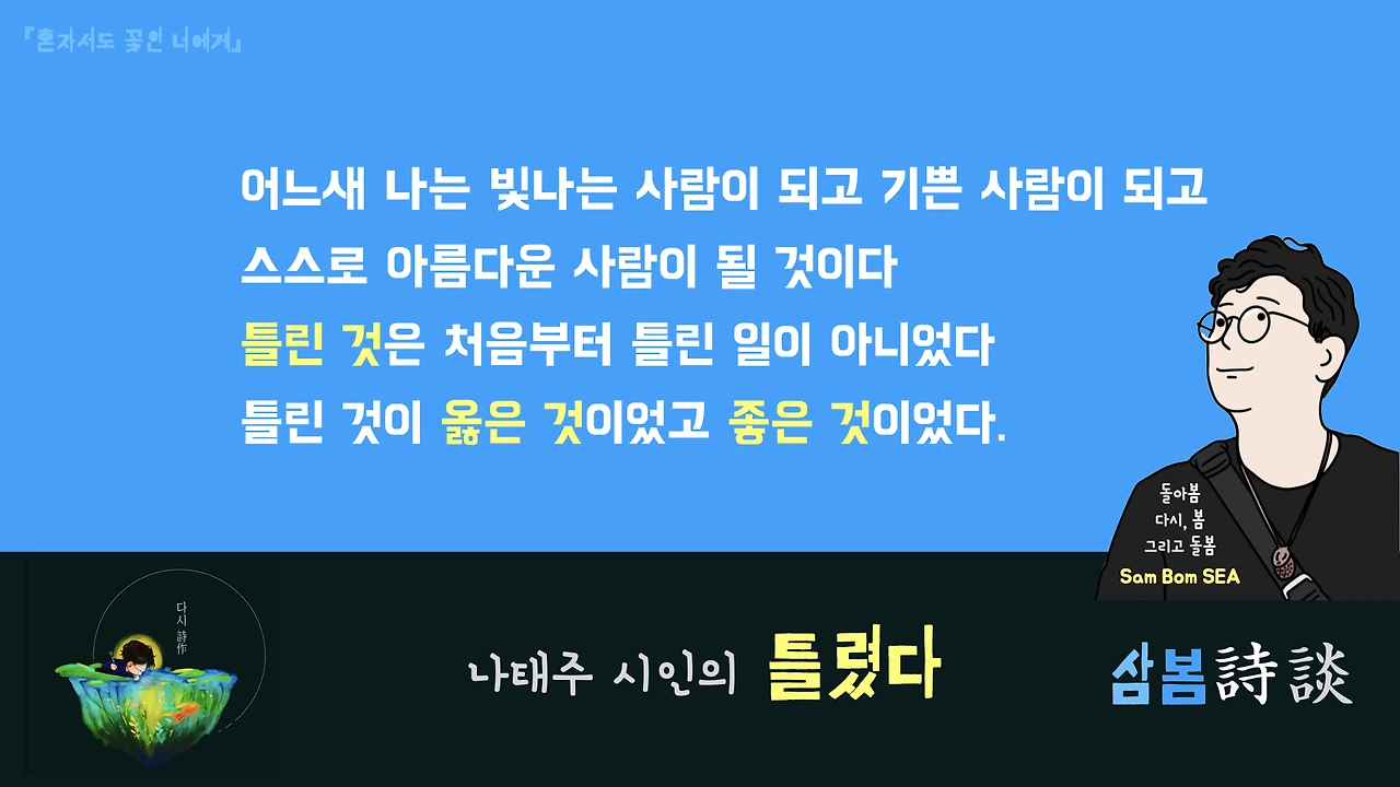 1년 전에 녹음해둔 나태주 시인의 <틀렸다>라는 시를 다시 들었습니다. ( http://www.podbbang.com/ch/1778522?e=23914759 ) 지난 20년간 애쓰며 버텨온 내 삶이 틀렸다는 것을 고통스럽게 받아들이고 있던 시절이었습니다. 우리는 삶에서 수많은 선택을 하고, 그 선택이 올바른 것이었음을 증명하기 위해서 끝없는 노력을 바치곤 합니다.