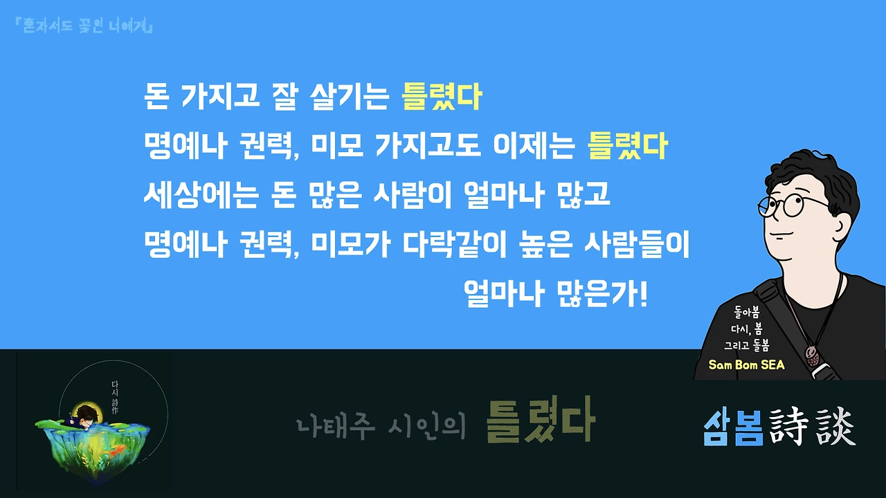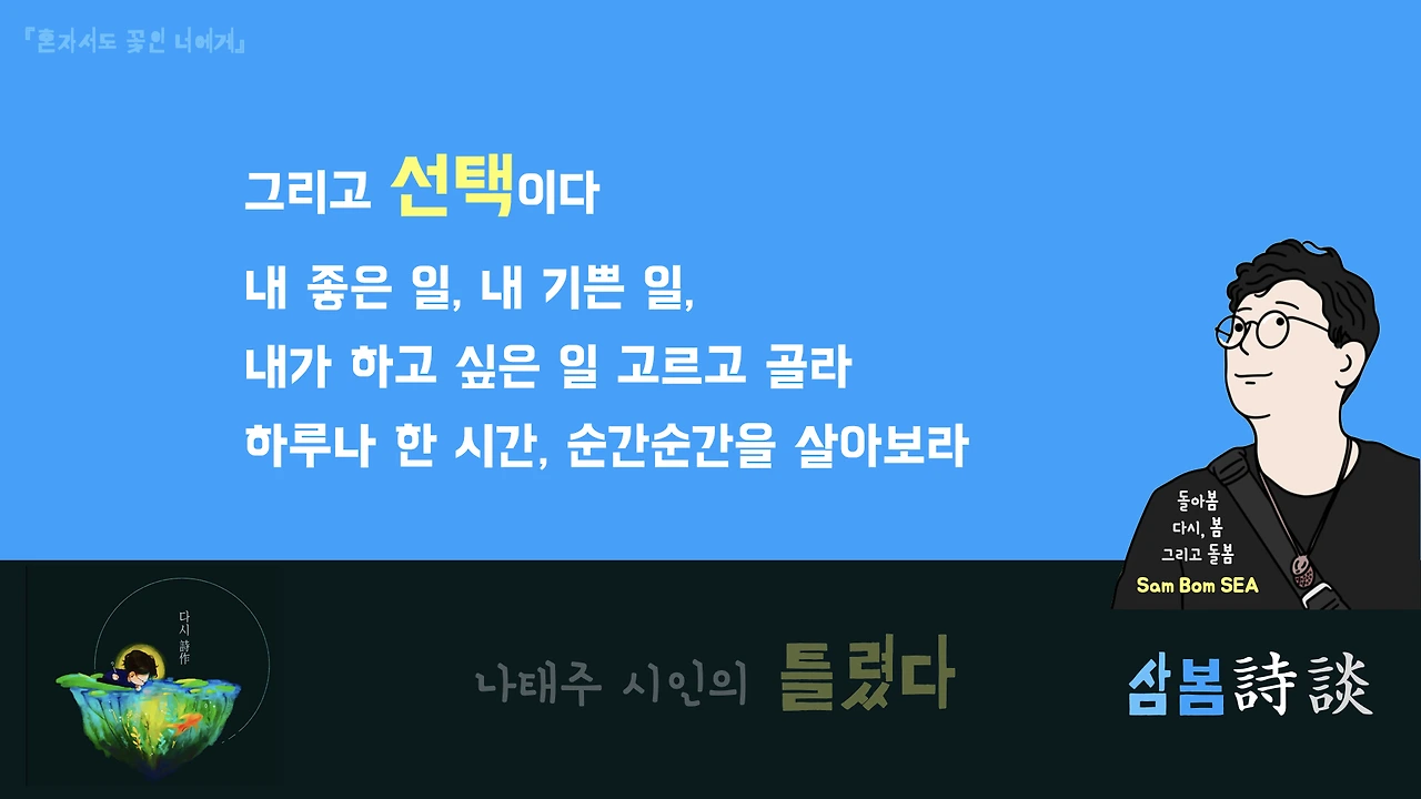 그러나 타인의 선택과 노력에 대해서는 함부로 틀렸다고 재단해서는 안 되겠지요. 자신의 삶조차 바로잡지 못하면서, 타인의 삶에 대해서 왈가왈부하는 순간들을 마주합니다. 부끄러운 순간입니다. 저의 삶부터 바로잡는 것이 먼저이겠지요.