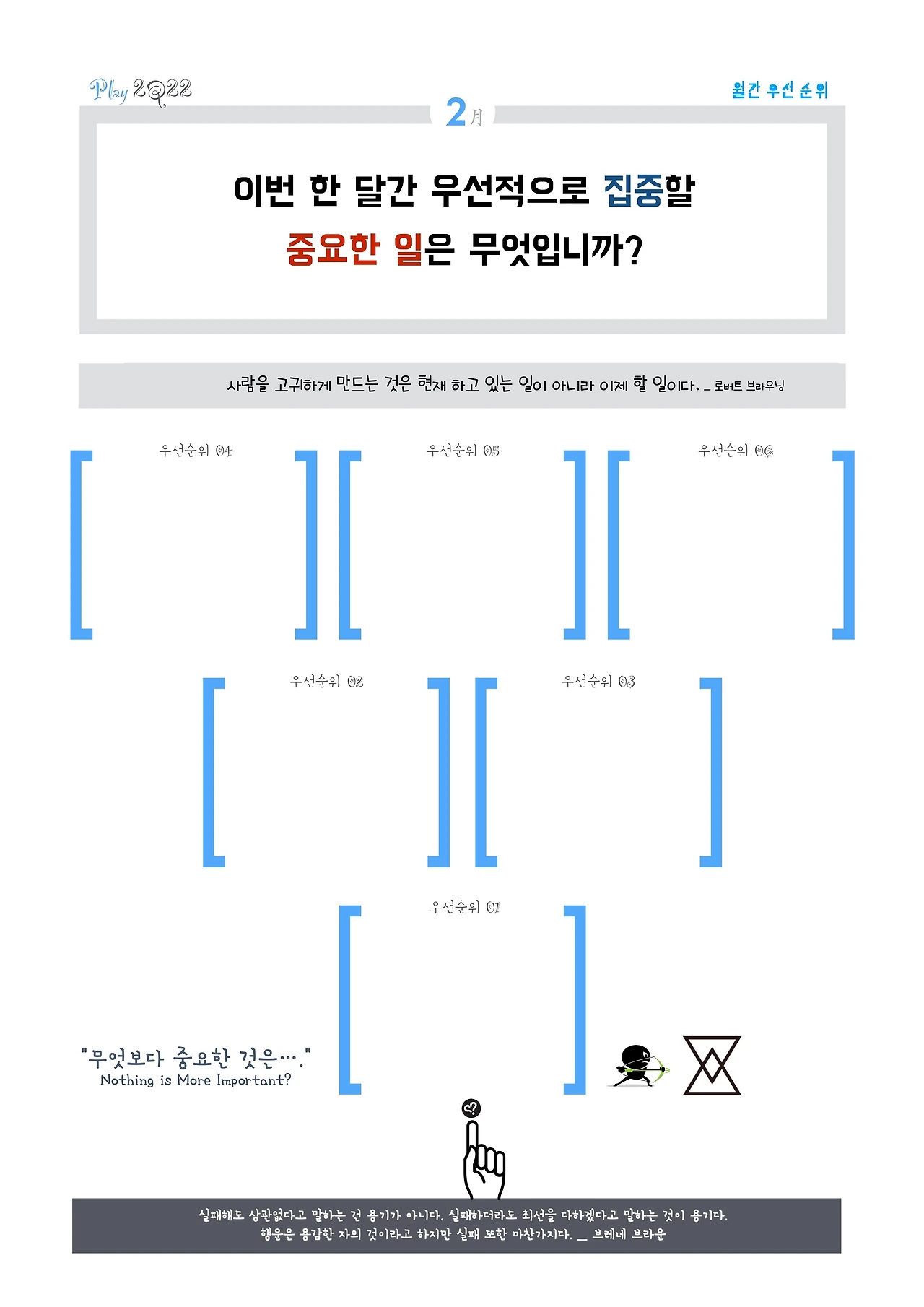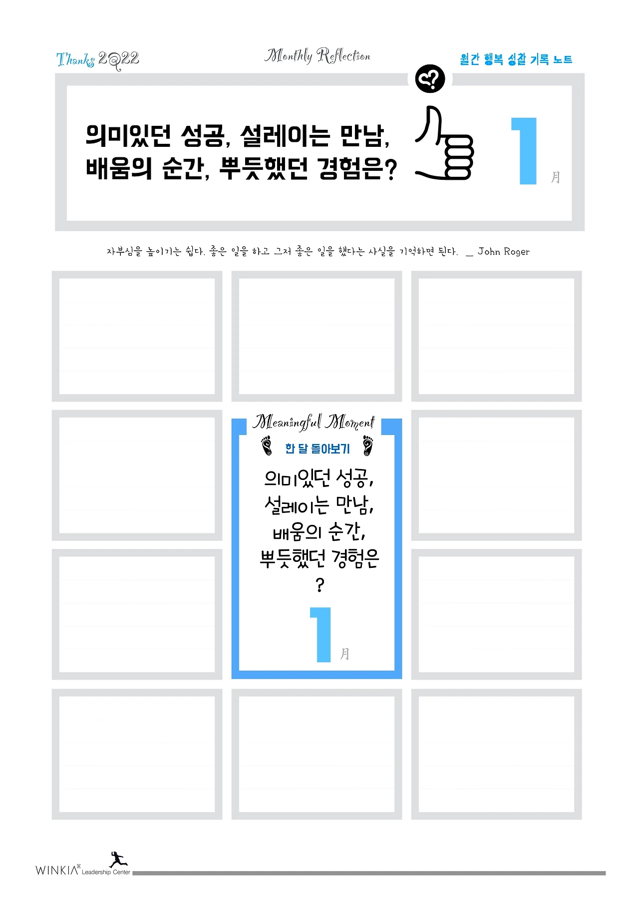 벗들에게 매월 ‘의미 있던 성공, 설레는 만남, 배움의 순간, 뿌듯했던 경험’들을 최소 10개 정도는 기록해보고, 다음 한 달간 우선적으로 집중할 중요한 일이 무엇인지 선택하고, 우선순위를 세워보라고 권하고 있습니다. 성찰은 우리가 스스로에게 선물할 수 있는 보너스가 아닐까요? 2022년 1월도 마무리되어가는 날입니다. 매달 월급통장에 찍힌 생존을 위한 ‘숫자’도 좋지만, 성찰 질문 노트에 끄적여 두는 생활을 위한 ‘기록’도 풍성해지길 기원해봅니다.