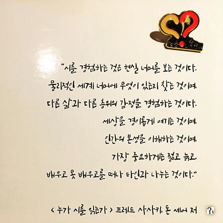 “시를 경험하는 것은 현실 너머를 보는 것이다. 물리적인 세계 너머에 무엇이 있는지 찾는 것이며, 다른 삶과 다른 층위의 감정을 경험하는 것이다. 세상을 경이롭게 여기는 것이며, 인간의 본성을 이해하는 것이며, 가장 중요하게는 젊고 늙고, 배우고 못 배우고를 떠나 타인과 나누는 것이다.”