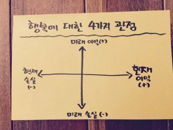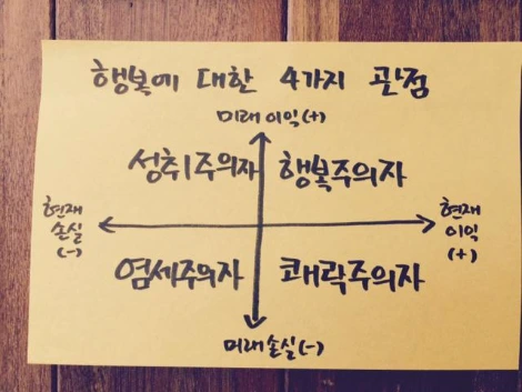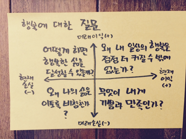 현재 일어날 손실과 미래 삶에서 일어날 손실에 대해 걱정하는 사람을 '염세주의자'라고 해 보자. 현재의 삶에 대해서도 부정적인 입장이고, 미래의 삶에 대해서도 부정적인 관점으로 바라보고 있다. 염세주의자의 관점에서 '행복한 삶'에 대해 질문을 만들어보라고 한다면, 어떤 질문을 만들 것 같은가? 현재의 삶에 대해서는 부정적이지만, 미래의 이익에 촛점을 두고 있는 '성취주의자'는 행복한 삶이란 핵심단어를 놓고 뭐라고 물을까? 미래의 장기적인 이익은 생각하지 않고, 당장의 만족을 추구하는 쾌락주의자에게 '행복한 삶'을 묻는다면 어떤 질문을 할까? 현재와 미래의 행복 모두를 중요시하는 '행복주의자'에게 질문을 만들어보라고 한다면?