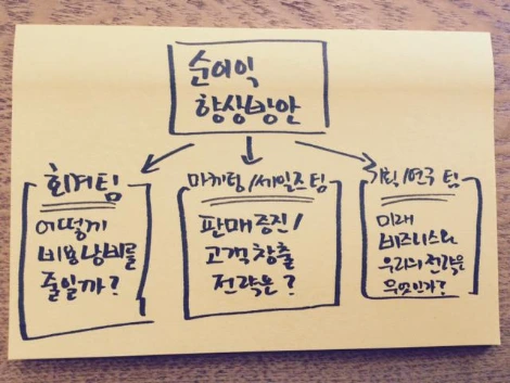 '순이익 향상'이라는 핵심단어(씨앗단어)를 가지고 일반 회사에서 질문을 만들면 소속된 팀에 따라 질문이 다르다. 비용의 집행과 절약을 책임으로 하는 회계팀에서는 '어떻게 하면 낭비되는 비용을 줄일 수 있을까?'를 묻는다. 익숙한 질문이기도 하며, 자신의 팀에서는 매출을 늘릴 수 있는 별다른 방법이 없다고 생각하기 때문이다. 자신의 역할과 관점이 생각까지도 제약하고 있다. 판매/마케팀은 '어떻게 더 많은 고객에게 더 많이 판매할 수 있을까?'를 묻고, 기획/연구부서에서는 '미래 비즈니스는 무엇이어야 하는가?'를 묻게 된다.