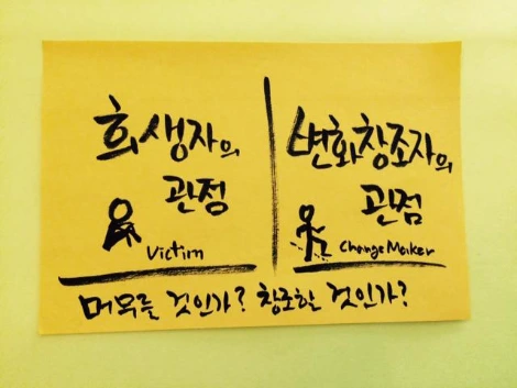 자기도 모르게 희생자의 질문을 하고 있다면, 변화를 만들어가는 질문들을 마주해보자. 희생자의 관점에 머무를 것인가, 변화를 창조하는 사람의 관점으로 나아갈 것인가? 혼자의 힘으로 변화를 만들어 낼 수 없다면 누구를 만나야 할지, 누구와 함께 할지를 모색하는 질문부터 시작해보자.