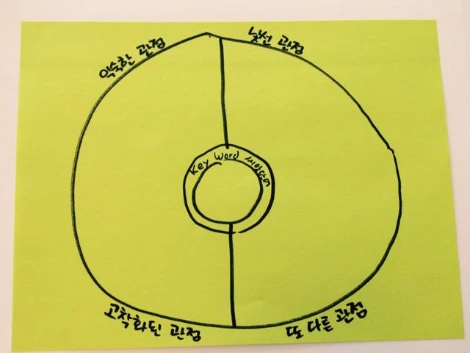 종이 한 가운데 고민하고자 하는 핵심단어(KeyWord, 씨앗단어)를 기록해보자. 그리고 종이를 크게 두 부분으로 나누는 선을 그어보자. 왼쪽에는 자신에게 익숙한 관점을 오른쪽에는 낯설지만 중요하다고 생각하는 또 다른 관점들을 기록해보자.