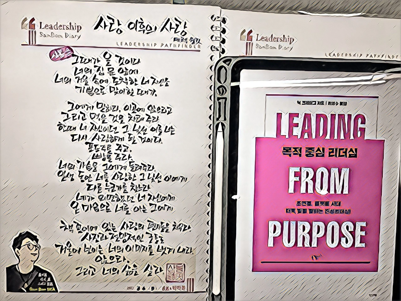 리더십은 ‘목적 선언에 그치는 것이 아니라 목적이 실현되어 결실을 맺도록 목적 경영 팀을 구축해 변화와 혁신을 이끌어가는 여정’이라고 오늘의 성찰 노트에 기록을 남겨둡니다. 아직도 가야 할 갈 길이 멀게만 느껴지지만, 이렇게 한 걸음씩 내딛다 보면 언젠가는 도착할 수 있겠지요. 이 길을 함께 걷는 분들에게 덕분에 포기하지 않고 있다고, 고마운 마음 덧붙여 남겨두고 싶습니다.