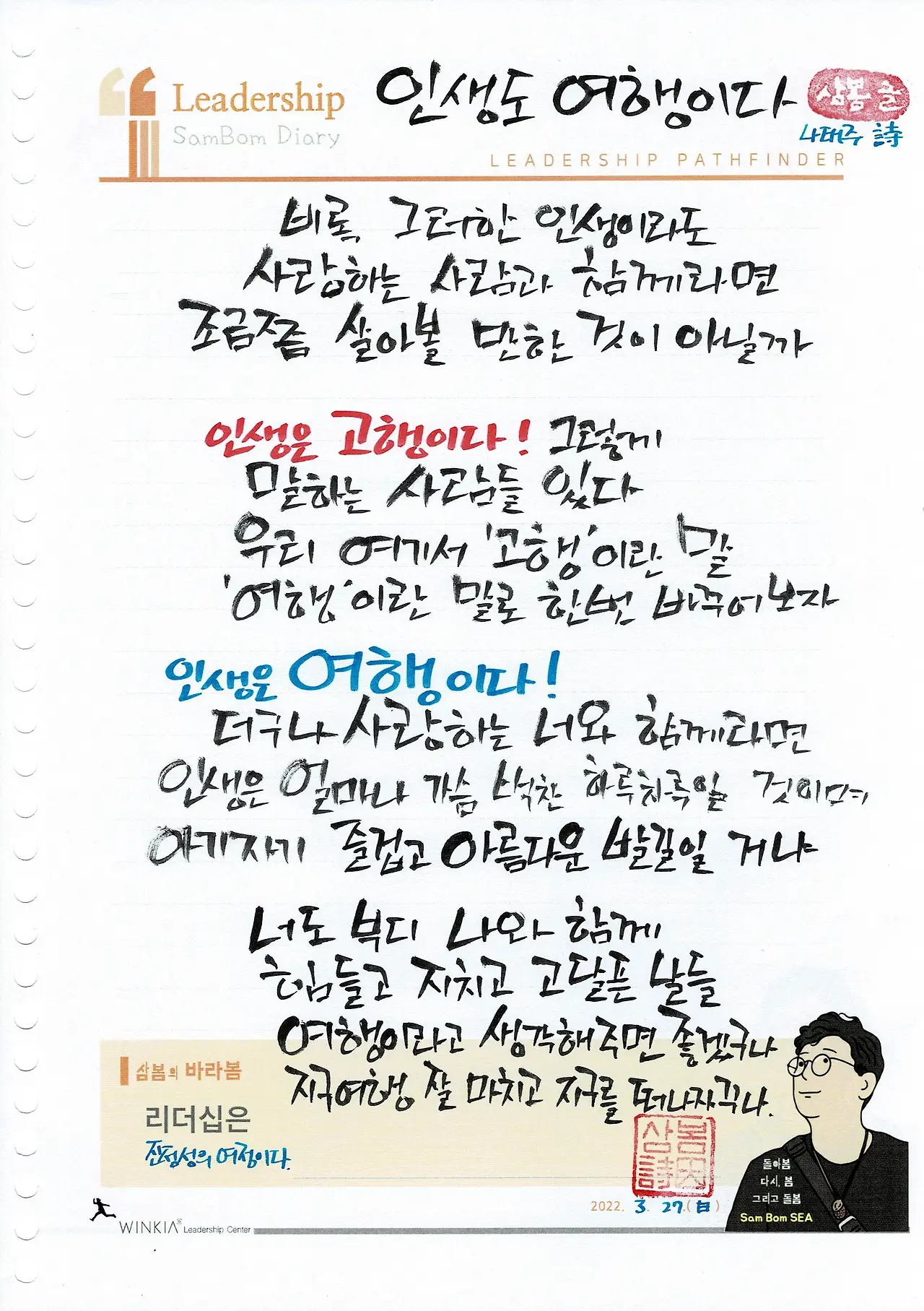여러분은 인생을 고행처럼 대하고 싶나요,여행처럼 즐기고 싶나요? 인생을 여행처럼 즐기는 모든 벗들을 응원하며, 삼봄시정원 팟빵에 녹음한 낭송본을 올려둡니다. 친구의 책도 많이 구입해 주시면 좋겠습니다.