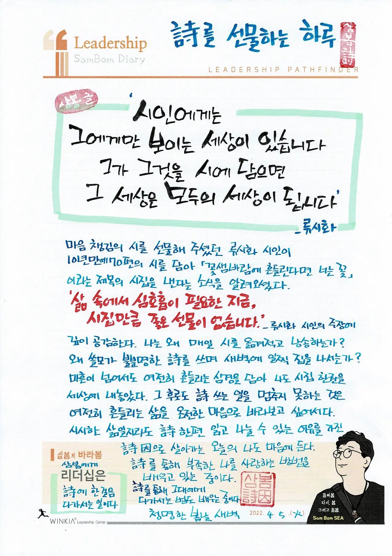 #삼봄詩談 : 코로나로 지쳐있던 시기에 <마음 챙김의 시>를 선물해 주셨던 류시화 시인께서 10년만에 70편의 시를 담아 <꽃샘바람에 흔들린다면 너는 꽃>이라는 제목의 신간 시집을 낸다는 소식을 알려오셨습니다.