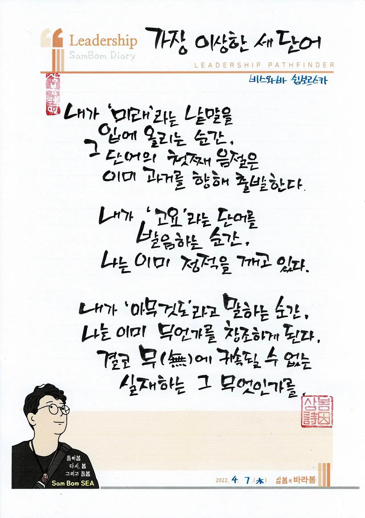 새벽에 일어나 비스와봐 쉼보르스카의 시선집 <끝과 시작>에서 ‘가장 이상한 세 단어’라는 시를 선택해 필사해보았습니다. 좋아하는 시인의 역설적 지혜가 가득 담긴 시를 옮겨적고 나니, 저도 시 한 편 끄적여두고 싶은 마음이 올라왔습니다. 가장 이상한 세 단어가 아니라, 요즘 제게 가장 아름답게 다가오는 세 단어 ‘봄’, ‘꽃’, ‘시’를 한 글자씩 써두고 떠도는 마음을 미숙한 글에다 담아둡니다.