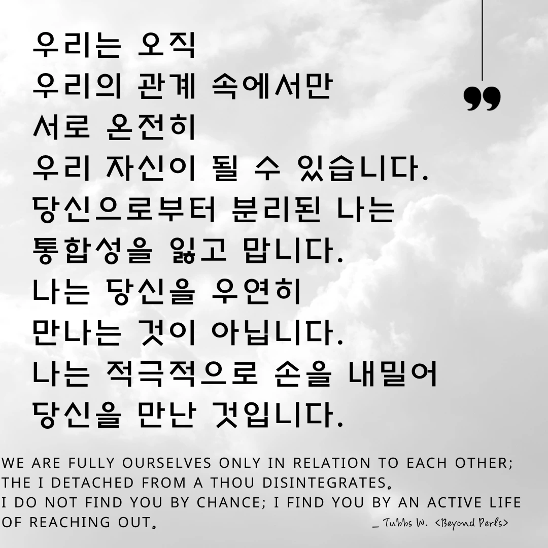우리는 오직 우리의 관계 속에서만 서로 온전히 우리 자신이 될 수 있습니다. 당신으로부터 분리된 나는 통합성을 잃고 맙니다. 나는 당신을 우연히 만나는 것이 아닙니다. 나는 적극적으로 손을 내밀어 당신을 만난 것입니다.