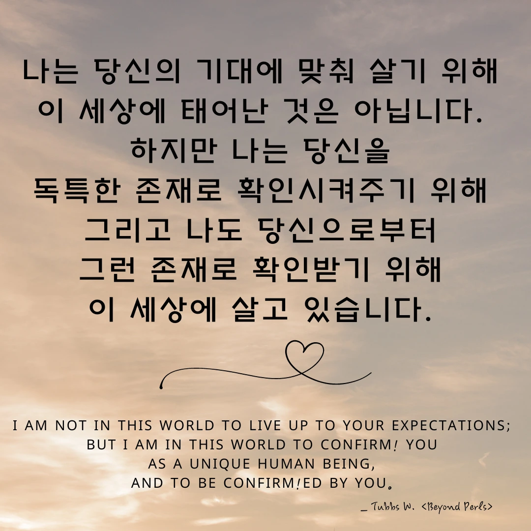 나는 당신의 기대에 맞춰 살기 위해 이 세상에 태어난 것은 아닙니다. 하지만 나는 당신을 독특한 존재로 확인시켜주기 위해 그리고 나도 당신으로부터 그런 존재로 확인받기 위해