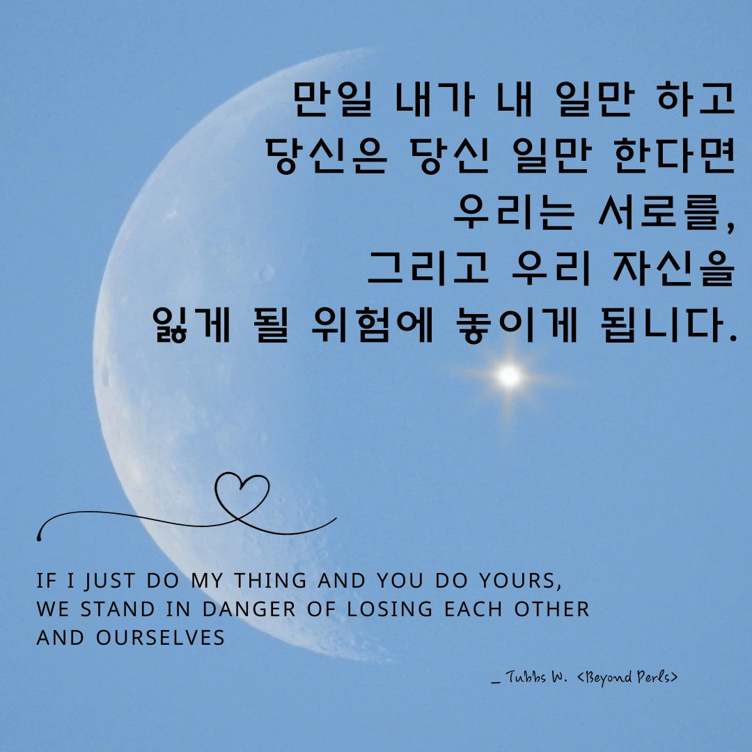 만일 내가 내 일만 하고 당신은 당신 일만 한다면 우리는 서로를, 그리고 우리 자신을 잃게 될 위험에 놓이게 됩니다.