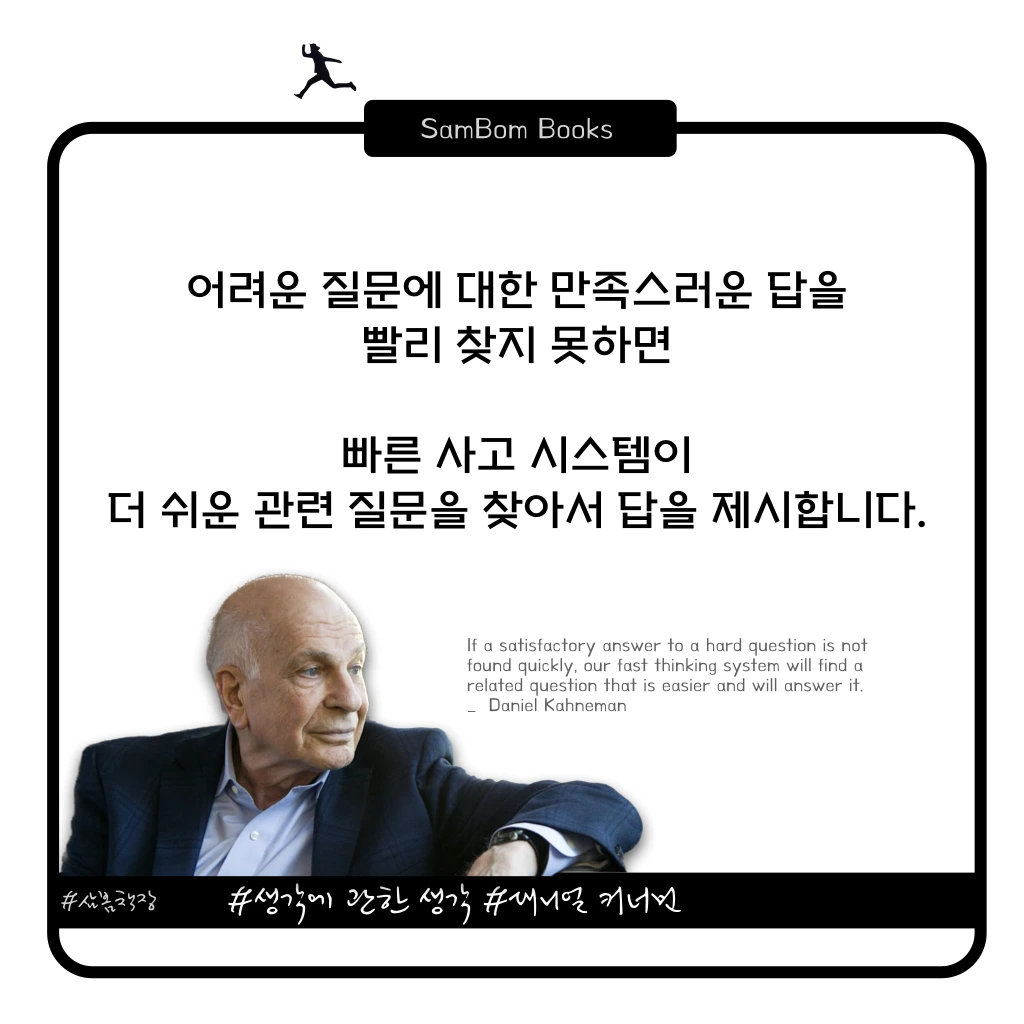 “If a satisfactory answer to a hard question is not found quickly, our fast thinking system will find a related question that is easier and will answer it.” "어려운 질문에 대한 만족스러운 답을 빨리 찾지 못하면 빠른 사고 시스템이 더 쉬운 관련 질문을 찾아서 답을 제시합니다."